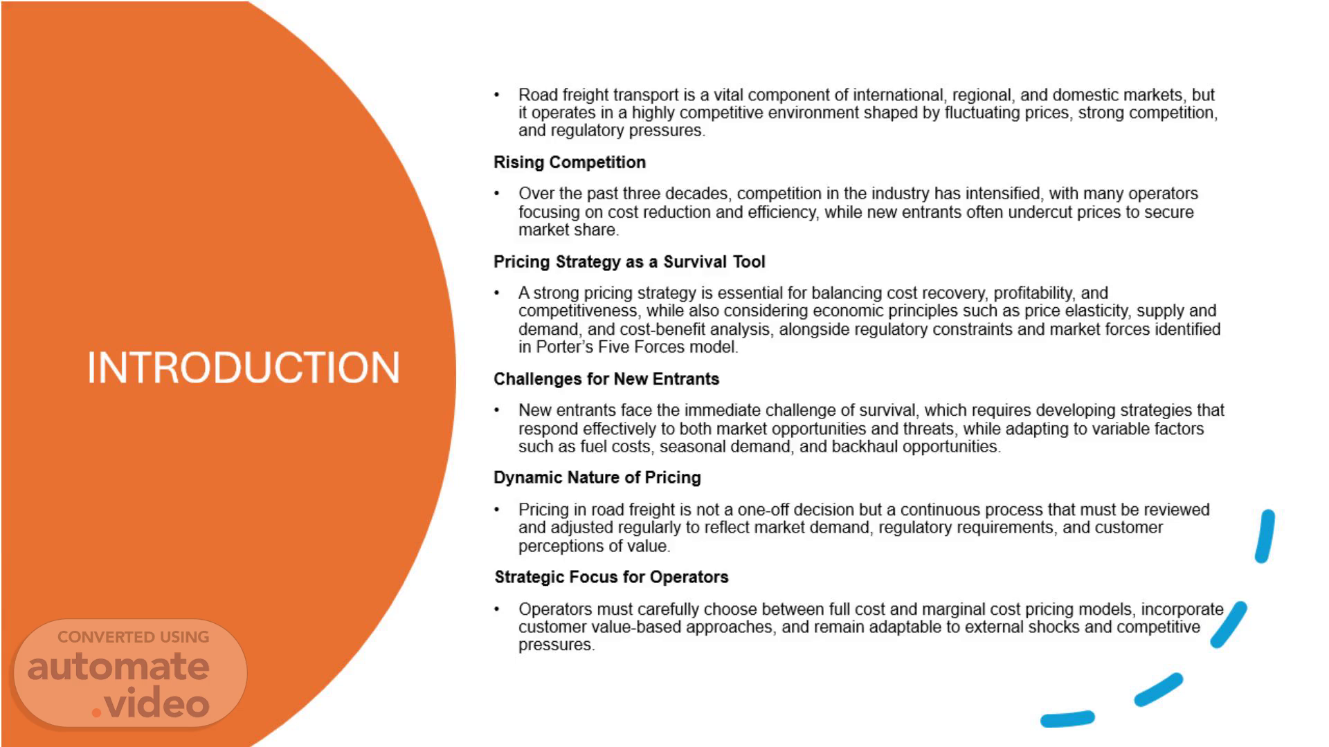 [Audio] Road freight transport is a vital component of international, regional, and domestic markets, but it operates in a highly competitive environment shaped by fluctuating prices, strong competition, and regulatory pressures. Rising Competition Over the past three decades, competition in the industry has intensified, with many operators focusing on cost reduction and efficiency, while new entrants often undercut prices to secure market share. Pricing Strategy as a Survival Tool A strong pricing strategy is essential for balancing cost recovery, profitability, and competitiveness, while also considering economic principles such as price elasticity, supply and demand, and cost-benefit analysis, alongside regulatory constraints and market forces identified in Porter’s Five Forces model. Challenges for New Entrants New entrants face the immediate challenge of survival, which requires developing strategies that respond effectively to both market opportunities and threats, while adapting to variable factors such as fuel costs, seasonal demand, and backhaul opportunities. Dynamic Nature of Pricing Pricing in road freight is not a one-off decision but a continuous process that must be reviewed and adjusted regularly to reflect market demand, regulatory requirements, and customer perceptions of value. Strategic Focus for Operators Operators must carefully choose between full cost and marginal cost pricing models, incorporate customer value-based approaches, and remain adaptable to external shocks and competitive pressures. INTRODUCTION Road freight transport is a vital component of international, regional, and domestic markets, but it operates in a highly competitive environment shaped by fluctuating prices, strong competition, and regulatory pressures. Rising Competition Over the past three decades, competition in the industry has intensified, with many operators focusing on cost reduction and efficiency, while new entrants often undercut prices to secure market share. Pricing Strategy as a Survival Tool A strong pricing strategy is essential for balancing cost recovery, profitability, and competitiveness, while also considering economic principles such as price elasticity, supply and demand, and cost-benefit analysis, alongside regulatory constraints and market forces identified in Porter's Five Forces model. Challenges for New Entrants New entrants face the immediate challenge of survival, which requires developing strategies that respond effectively to both market opportunities and threats, while adapting to variable factors such as fuel costs, seasonal demand, and backhaul opportunities. Dynamic Nature of Pricing Pricing in road freight is not a one-off decision but a continuous process that must be reviewed and adjusted regularly to reflect market demand, regulatory requirements, and customer perceptions of value. Strategic Focus for Operators Operators must carefully choose between full cost and marginal cost pricing models, incorporate customer value-based approaches, and remain adaptable to external shocks and competitive pressures..
