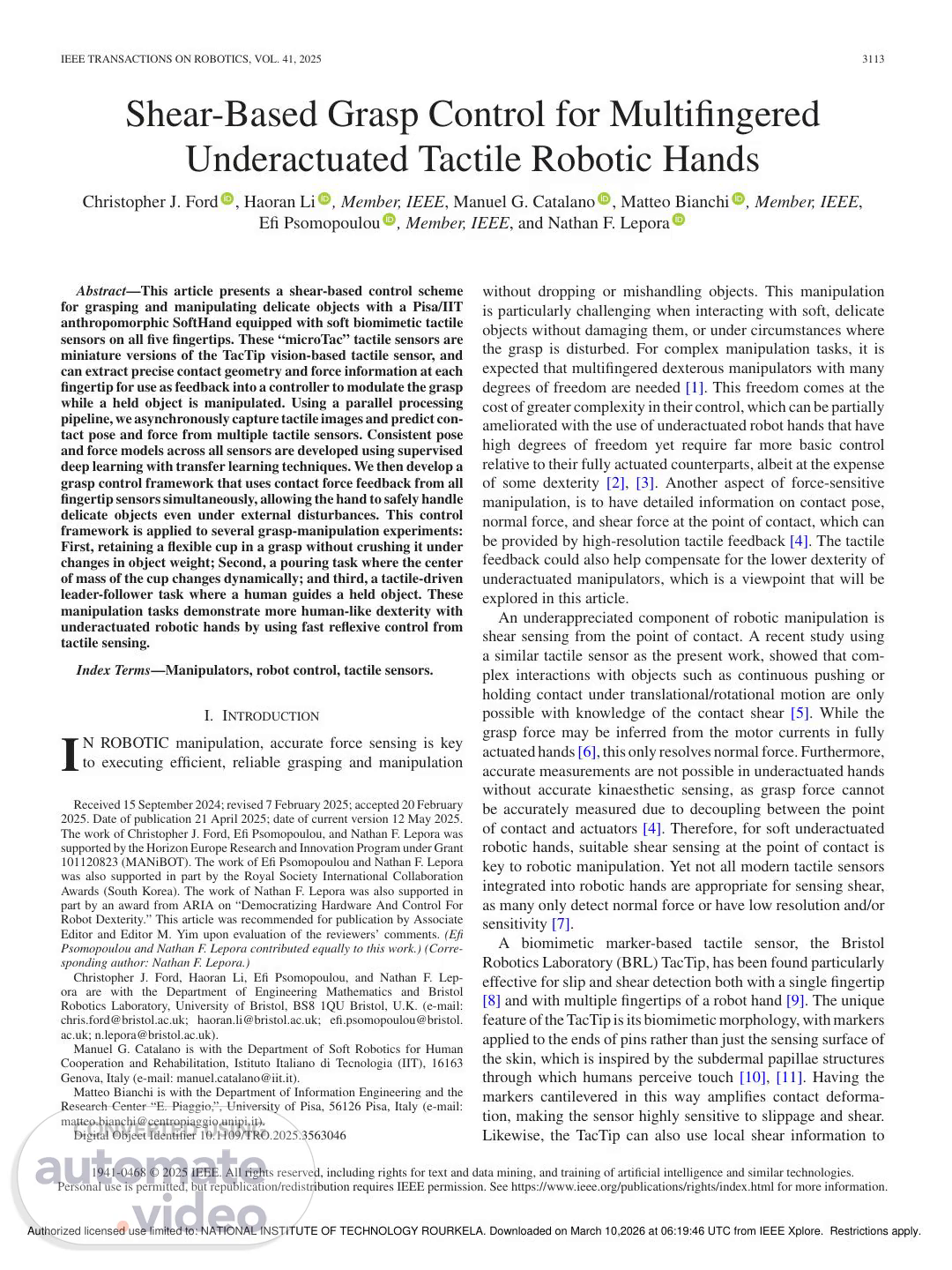 IEEE TRANSACTIONS ON ROBOTICS, VOL. 41, 2025 3113 Shear-Based Grasp Control for Multifingered Underactuated Tactile Robotic Hands Christopher J. Ford , Haoran Li , Member, IEEE, Manuel G. Catalano , Matteo Bianchi , Member, IEEE, Efi Psomopoulou , Member, IEEE, and Nathan F. Lepora Abstract—This article presents a shear-based control scheme for grasping and manipulating delicate objects with a Pisa/IIT anthropomorphic SoftHand equipped with soft biomimetic tactile sensors on all five fingertips. These “microTac” tactile sensors are miniature versions of the TacTip vision-based tactile sensor, and can extract precise contact geometry and force information at each fingertip for use as feedback into a controller to modulate the grasp while a held object is manipulated. Using a parallel processing pipeline, we asynchronously capture tactile images and predict con- tact pose and force from multiple tactile sensors. Consistent pose and force models across all sensors are developed using supervised deep learning with transfer learning techniques. We then develop a grasp control framework that uses contact force feedback from all fingertip sensors simultaneously, allowing the hand to safely handle delicate objects even under external disturbances. This control framework is applied to several grasp-manipulation experiments: First, retaining a flexible cup in a grasp without crushing it under changes in object weight; Second, a pouring task where the center of mass of the cup changes dynamically; and third, a tactile-driven leader-follower task where a human guides a held object. These manipulation tasks demonstrate more human-like dexterity with underactuated robotic hands by using fast reflexive control from tactile sensing. Index Terms—Manipulators, robot control, tactile sensors. I. INTRODUCTION I N ROBOTIC manipulation, accurate force sensing is key to executing efficient, reliable grasping and manipulation Received 15 September 2024; revised 7 February 2025; accepted 20 February 2025. Date of publication 21 April 2025; date of current version 12 May 2025. The work of Christopher J. Ford, Efi Psomopoulou, and Nathan F. Lepora was supported by the Horizon Europe Research and Innovation Program under Grant 101120823 (MANiBOT). The work of Efi Psomopoulou and Nathan F. Lepora was also supported in part by the Royal Society International Collaboration Awards (South Korea). The work of Nathan F. Lepora was also supported in part by an award from ARIA on “Democratizing Hardware And Control For Robot Dexterity.” This article was recommended for publication by Associate Editor and Editor M. Yim upon evaluation of the reviewers’ comments. (Efi Psomopoulou and Nathan F. Lepora contributed equally to this work.) (Corre- sponding author: Nathan F. Lepora.) Christopher J. Ford, Haoran Li, Efi Psomopoulou, and Nathan F. Lep- ora are with the Department of Engineering Mathematics and Bristol Robotics Laboratory, University of Bristol, BS8 1QU Bristol, U.K. (e-mail: [email protected]; [email protected]; efi.psomopoulou@bristol. ac.uk; [email protected]). Manuel G. Catalano is with the Department of Soft Robotics for Human Cooperation and Rehabilitation, Istituto Italiano di Tecnologia (IIT), 16163 Genova, Italy (e-mail: [email protected]). Matteo Bianchi is with the Department of Information Engineering and the Research Center “E. Piaggio,”, University of Pisa, 56126 Pisa, Italy (e-mail: [email protected]). Digital Object Identifier 10.1109/TRO.2025.3563046 without dropping or mishandling objects. This manipulation is particularly challenging when interacting with soft, delicate objects without damaging them, or under circumstances where the grasp is disturbed. For complex manipulation tasks, it is expected that multifingered dexterous manipulators with many degrees of freedom are needed [1]. This freedom comes at the cost of greater complexity in their control, which can be partially ameliorated with the use of underactuated robot hands that have high degrees of freedom yet require far more basic control relative to their fully actuated counterparts, albeit at the expense of some dexterity [2], [3]. Another aspect of force-sensitive manipulation, is to have detailed information on contact pose, normal force, and shear force at the point of contact, which can be provided by high-resolution tactile feedback [4]. The tactile feedback could also help compensate for the lower dexterity of underactuated manipulators, which is a viewpoint that will be explored in this article. An underappreciated component of robotic manipulation is shear sensing from the point of contact. A recent study using a similar tactile sensor as the present work, showed that com- plex interactions with objects such as continuous pushing or holding contact under translational/rotational motion are only possible with knowledge of the contact shear [5]. While the grasp force may be inferred from the motor currents in fully actuated hands [6], this only resolves normal force. Furthermore, accurate measurements are not possible in underactuated hands without accurate kinaesthetic sensing, as grasp force cannot be accurately measured due to decoupling between the point of contact and actuators [4]. Therefore, for soft underactuated robotic hands, suitable shear sensing at the point of contact is key to robotic manipulation. Yet not all modern tactile sensors integrated into robotic hands are appropriate for sensing shear, as many only detect normal force or have low resolution and/or sensitivity [7]. A biomimetic marker-based tactile sensor, the Bristol Robotics Laboratory (BRL) TacTip, has been found particularly effective for slip and shear detection both with a single fingertip [8] and with multiple fingertips of a robot hand [9]. The unique feature of the TacTip is its biomimetic morphology, with markers applied to the ends of pins rather than just the sensing surface of the skin, which is inspired by the subdermal papilla