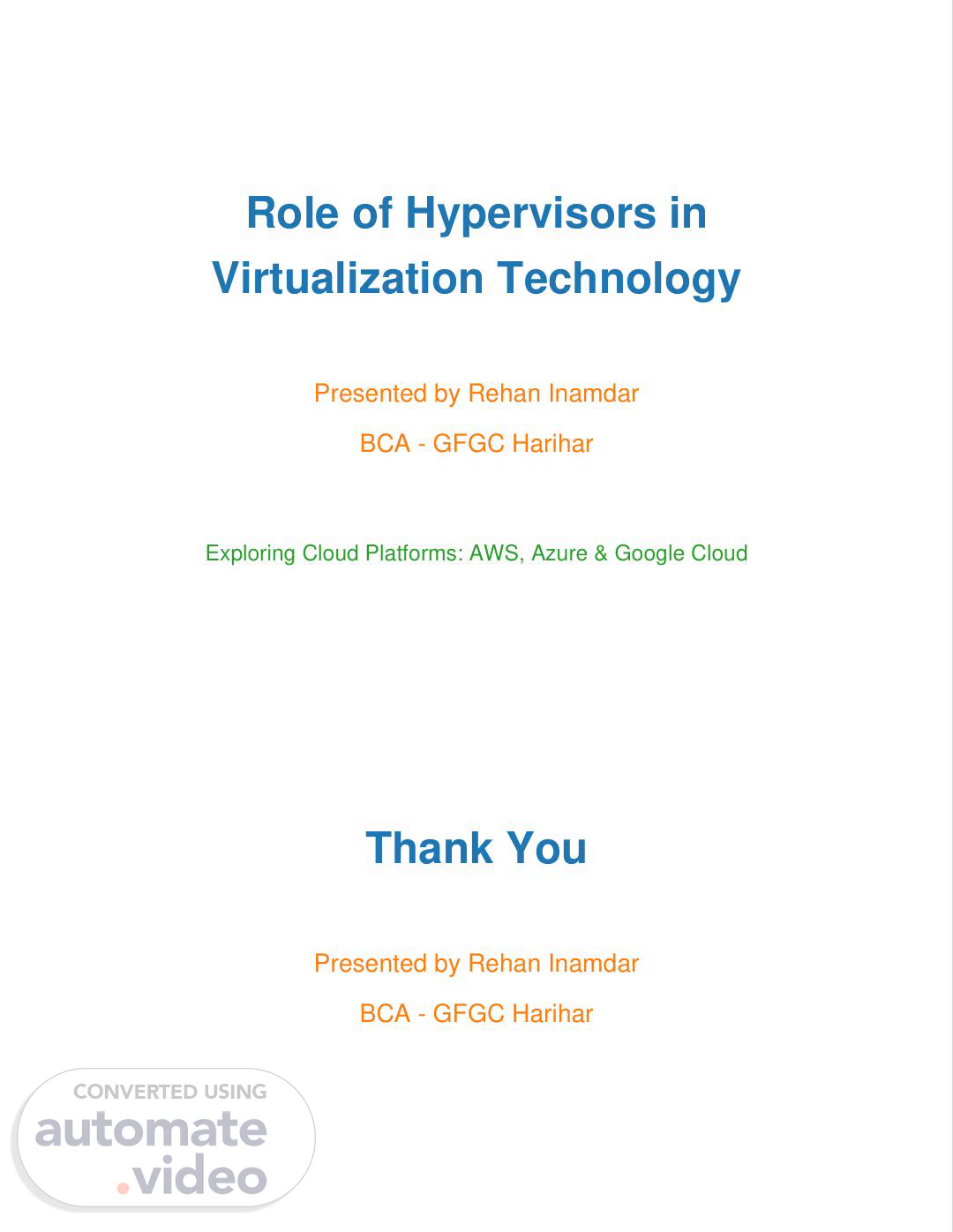 Role of Hypervisors in Virtualization Technology Presented by Rehan Inamdar BCA - GFGC Harihar Exploring Cloud Platforms: AWS, Azure & Google Cloud Thank You Presented by Rehan Inamdar BCA - GFGC Harihar.
