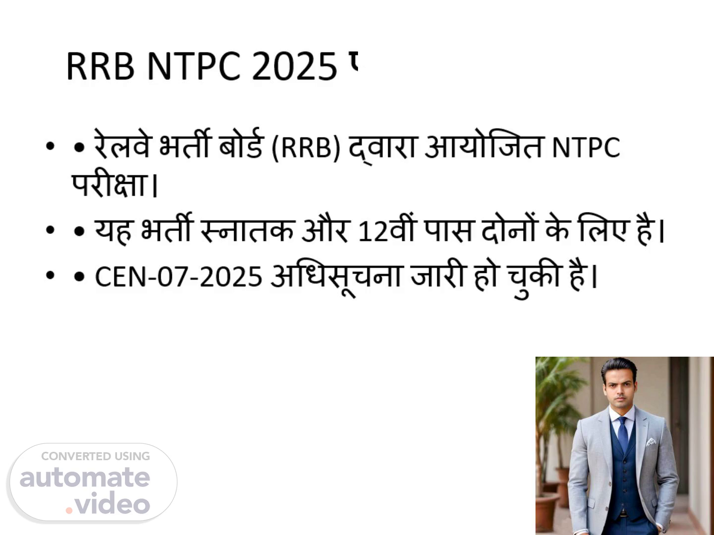 RRB NTPC 2025 परीक्षा का परिचय. • रेलवे भर्ती बोर्ड (RRB) द्वारा आयोजित NTPC परीक्षा। • यह भर्ती स्नातक और 12वीं पास दोनों के लिए है। • CEN-07-2025 अधिसूचना जारी हो चुकी है।.