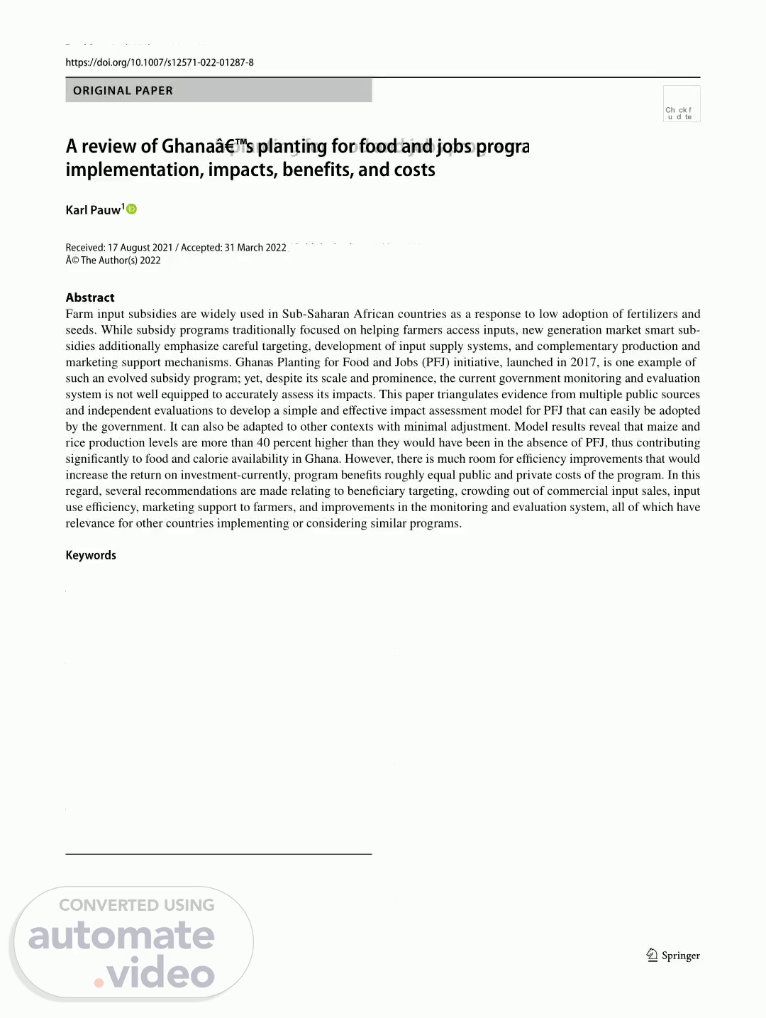 [Audio] Through the Planting for Food and Jobs initiative, Ghana has seen significant boosts in maize and rice production, reaching an excess of 40%. This has had a crucial role in increasing the availability of food and calories throughout the country. However, as with all large-scale projects, there is a great deal still to be done to raise the efficacy and efficacy of the program to ensure the highest return on investment. The aim of this paper is to evaluate the implementation, effects, advantages and costs of the Planting for Food and Jobs initiative, and to establish an elementary impact appraisal model that can be adopted by the government to review and enhance the program..