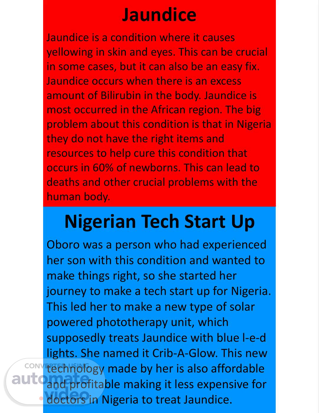 [Audio] Jaundice Jaundice is a condition where it causes yellowing in skin and eyes. This can be crucial in some cases but it can also be an easy fix. Jaundice occurs when there is an excess amount of Bilirubin in the body. Jaundice is most occurred in the African region. The big problem about this condition is that in Nigeria they do not have the right items and resources to help cure this condition that occurs in 60% of newborns. This can lead to deaths and other crucial problems with the human body. Nigerian Tech Start Up Oboro was a person who had experienced her son with this condition and wanted to make things right so she started her journey to make a tech start up for Nigeria. This led her to make a new type of solar powered phototherapy unit which supposedly treats Jaundice with blue l-e-d lights. She named it Crib-A-Glow. This new technology made by her is also affordable and profitable making it less expensive for doctors in Nigeria to treat Jaundice..