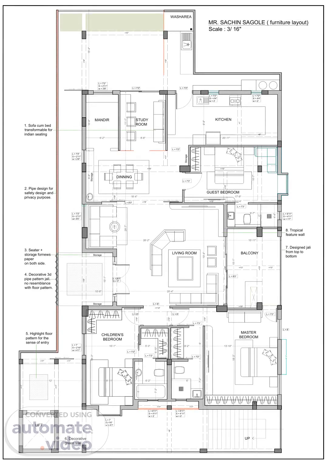 . MANDIR KITCHEN DINNING LIVING ROOM GUEST BEDROOM CHILDREN'S BEDROOM MASTER BEDROOM UP +1'5" +1'5" +1'5" +1'5" +1'5" +1'3" +1'3" +1'3" +8" +1'5" +1'5" +1'5" +1' +1' +1'5" +1'5" +1'5" +1'10" +1'5" +1'5" +9" +7" +11" +11" +11" +11" +10" +7" +11" +11" +11" +1' +10" +10" +10" L = 8' L = 7'2" L = 7'3" L = 7' S =1'6" w = 4'1" L = 7' S = 2'10" w = 4'1" L = 6'11" S = 4'11" w = 2' L = 7'2" L = 7'2" L = 7'2" L = 8'3" S = 3" L = 7'2" S = 2'11" w = 2'6" L = 7'2" S = 2'11" w= 4'5" L = 7'2" S = 2'11" w = 3'8" L = 7'2" S = 4'4" w = 2' L = 7'2" L = 7'3" L = 7'3" L = 8'3" L = 8'3" L = 8' L = 6'11" S = 4'11" w = 1'7" STUDY ROOM WASHAREA LIFT 6'-2" 10'-8" 8'-8" 11'-1" 9'-8" 9'-9" 18'-4" 26'-2" 19'-4" 20'-4" 10'-11" 15'-1" 17'-9" 10'-7" 4'-4" 9'-7" 18'-3" 10'-1" 8'-11" 6'-2" 5'-10" 7'-3" 6' 7'-2" 13'-10" 18'-3" 8'-3" 4'-6" 15'-4" 29'-7" 10'-9" 10'-1" 6' 6'-2" 5'-3" 12' Storage Storage Storage Storage 6. Decorative green wall 4. Decorative 3d pipe pattern jali. no resemblance with floor pattern. 3. Seater + storage fornews paper on both side. 2. Pipe design for safety design and privacy purpose. 1. Sofa cum bed transformable for indian seating 8. Tropical feature wall 7. Designed jali from top to bottom L = 6'11" S = 4'11" w = 2' 5. Highlight floor pattern for the sense of entry BALCONY MR. SACHIN SAGOLE ( furniture layout) Scale : 3/ 16" 20'-11" L = 7'2" L = 7'2" L = 8' L = 8' L = 7'2" S = 4'4" w = 2' 6'-8".