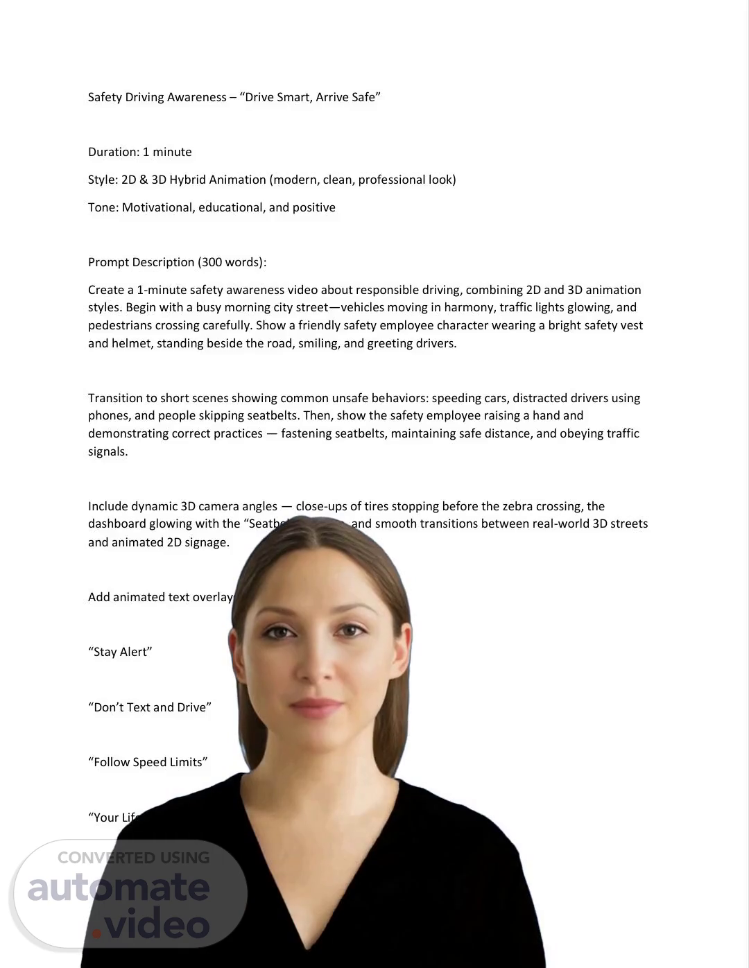 [Virtual Presenter] The purpose of this project is to create a safety awareness video that educates viewers on safe driving practices. The objective is to promote a culture of safety among drivers and passengers. To achieve this, the video will cover various aspects of safe driving such as road signs, traffic rules, and emergency procedures. The video will also provide tips on how to stay safe while driving, including avoiding distractions like texting and talking on the phone. Additionally, it will emphasize the importance of wearing seatbelts and following speed limits. The ultimate goal is to equip viewers with the knowledge and skills necessary to drive safely and responsibly. By the end of the video, viewers should be able to identify potential hazards and take corrective action to prevent accidents. The video will be designed to engage and inform its target audience, making it an effective tool for promoting road safety..