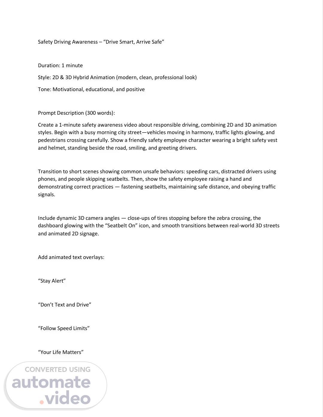 Safety Driving Awareness – “Drive Smart, Arrive Safe” Duration: 1 minute Style: 2D & 3D Hybrid Animation (modern, clean, professional look) Tone: Motivational, educational, and positive Prompt Description (300 words): Create a 1-minute safety awareness video about responsible driving, combining 2D and 3D animation styles. Begin with a busy morning city street—vehicles moving in harmony, traffic lights glowing, and pedestrians crossing carefully. Show a friendly safety employee character wearing a bright safety vest and helmet, standing beside the road, smiling, and greeting drivers. Transition to short scenes showing common unsafe behaviors: speeding cars, distracted drivers using phones, and people skipping seatbelts. Then, show the safety employee raising a hand and demonstrating correct practices — fastening seatbelts, maintaining safe distance, and obeying traffic signals. Include dynamic 3D camera angles — close-ups of tires stopping before the zebra crossing, the dashboard glowing with the “Seatbelt On” icon, and smooth transitions between real-world 3D streets and animated 2D signage. Add animated text overlays: “Stay Alert” “Don’t Text and Drive” “Follow Speed Limits” “Your Life Matters”.