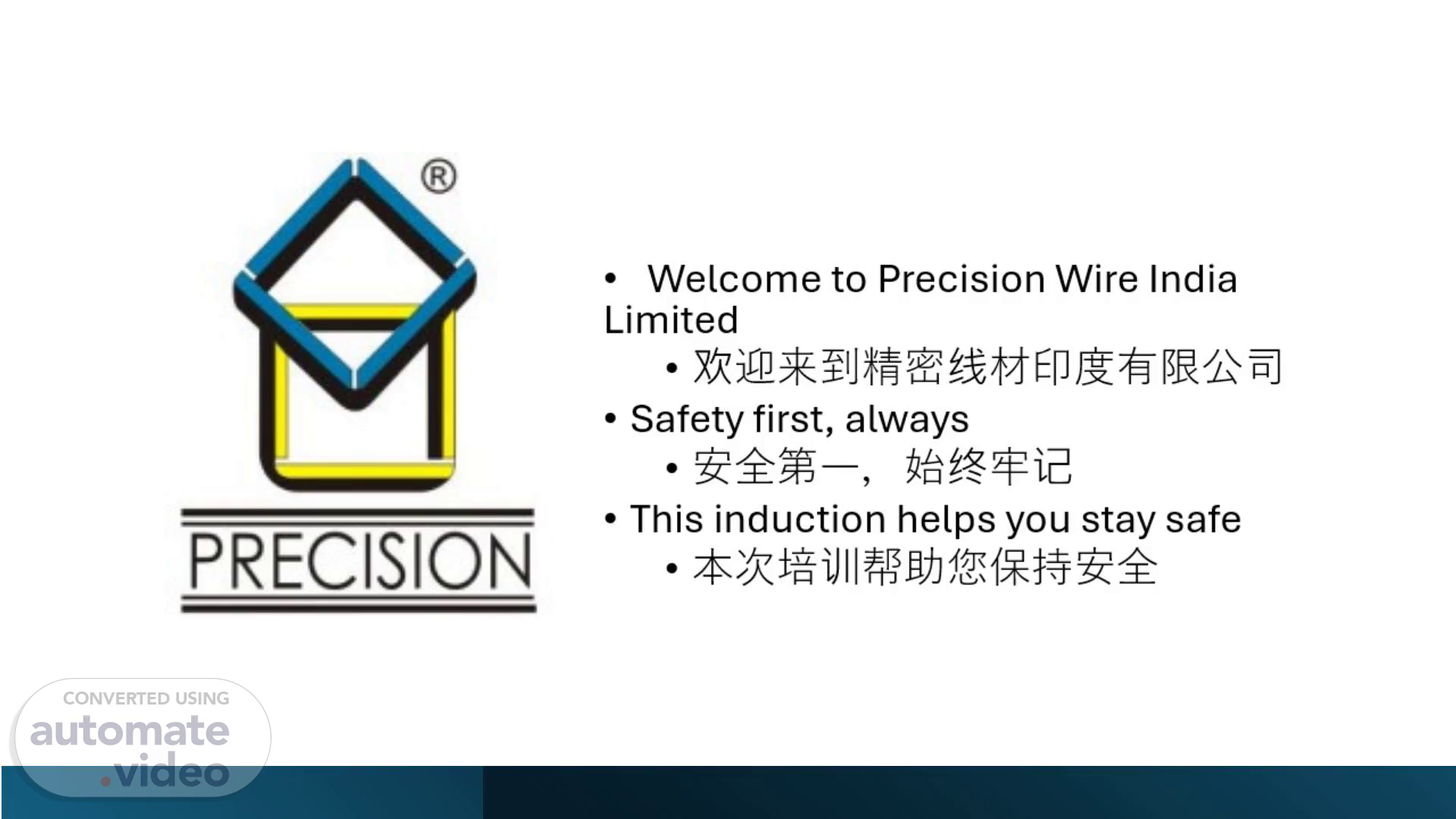 [Audio] Welcome to Precision Wire India Limited 欢迎来到精密线材印度有限公司 Safety first, always 安全第一,始终牢记 This induction helps you stay safe 本次培训帮助您保持安全.