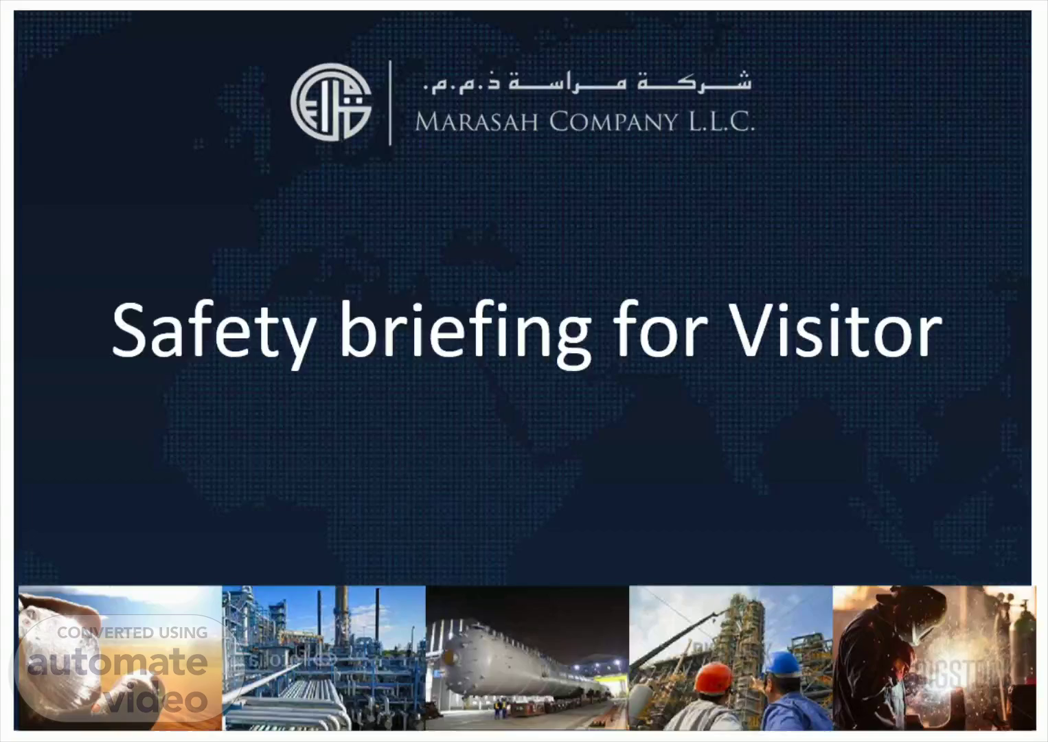 [Audio] WE HAVE DEVELOPED THIS MARASAH VISITOR SAFETY PROGRAM TO HELP ENSURE SAFETY, BOTH YOURS AND OTHERS. WHILE YOU VISIT OUR FACILITY. WE EXPECT YOU TO BEHAVE WITH THE SAME HIGH LEVEL OF CONCERN FOR SAFETY, HEALTH, SECURITY, AND ENVIRONMENTAL PROTECTION AS OUR PEOPLE DO, COMPLING WITH ALL APPLICABLE REGULATIONS FOR THIS LOCATION. PLEASE PAY CLOSE ATTENTION TO THIS MESSAGE THAT OUTLINES THE RULES AND EXPECTED BEHAVIORS FOR ALL VISITORS TO MARASAH PROPERTY. WE STRIVE TO PROVIDE A SAFE, AND RESPECTFUL ENVIRONMENT FOR EVERYONE..