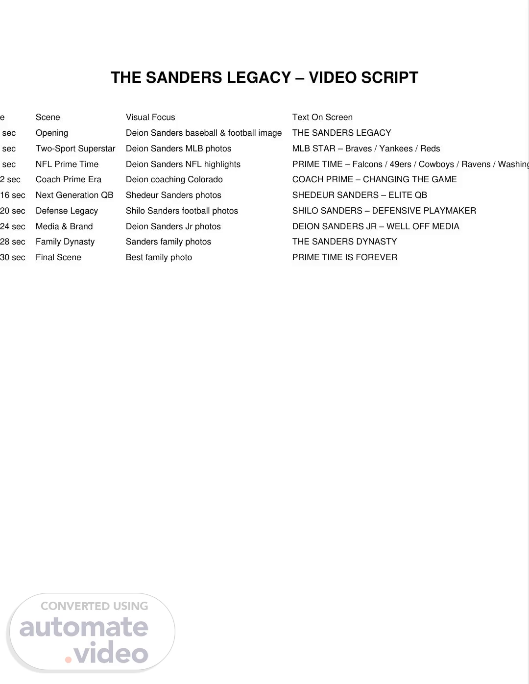 [Audio] The Sanders Legacy Video Script and Scene Visuals [Opening Scene: Describing Deion Sanders as a baseball and football player] Text on screen: Deion Sanders Baseball & Football [Scene shifts to showcasing Deion's accomplishments as a two sport superstar] Text on screen: The Sanders Legacy Two Sport Superstar [Photos of Deion in Major League Baseball with the Braves, Yankees, and Reds] [Scene changes to Deion's success in the N-F-L as Prime Time] Text on screen: N-F-L Deion Sanders [Highlights of Deion's career with the Falcons, 49ers, Cowboys, Ravens, and Washington] [Scene transitions to Deion's current role as a coach] Text on screen: Coach Prime Era Deion coaching Colorado [Photos of Deion coaching] Text on screen: P-R-I-M-E CHANGING The G-A-M-E [Scene showcases Deion's son, Shedeur Sanders, as an elite quarterback] Text on screen: Next Generation QB Shedeur Sanders [Photos of Shedeur playing football] [Scene shifts to Deion's son, Shilo Sanders, and his legacy in defense] Text on screen: Defense Legacy Shilo Sanders [Photos of Shilo making plays on the field] [Scene focuses on Deion's media presence and brand] Text on screen: Media & Brand Deion Sanders Jr. [Photos of Deion's son, Deion Sanders Jr., in the media] [Scene transitions to Deion's family and their dynasty] Text on screen: Family Dynasty The Sanders Family [Photos of the Sanders family together] [Final scene with a photo of the entire Sanders family] Text on screen: P-R-I-M-E time IS ForEVER Best family photo..