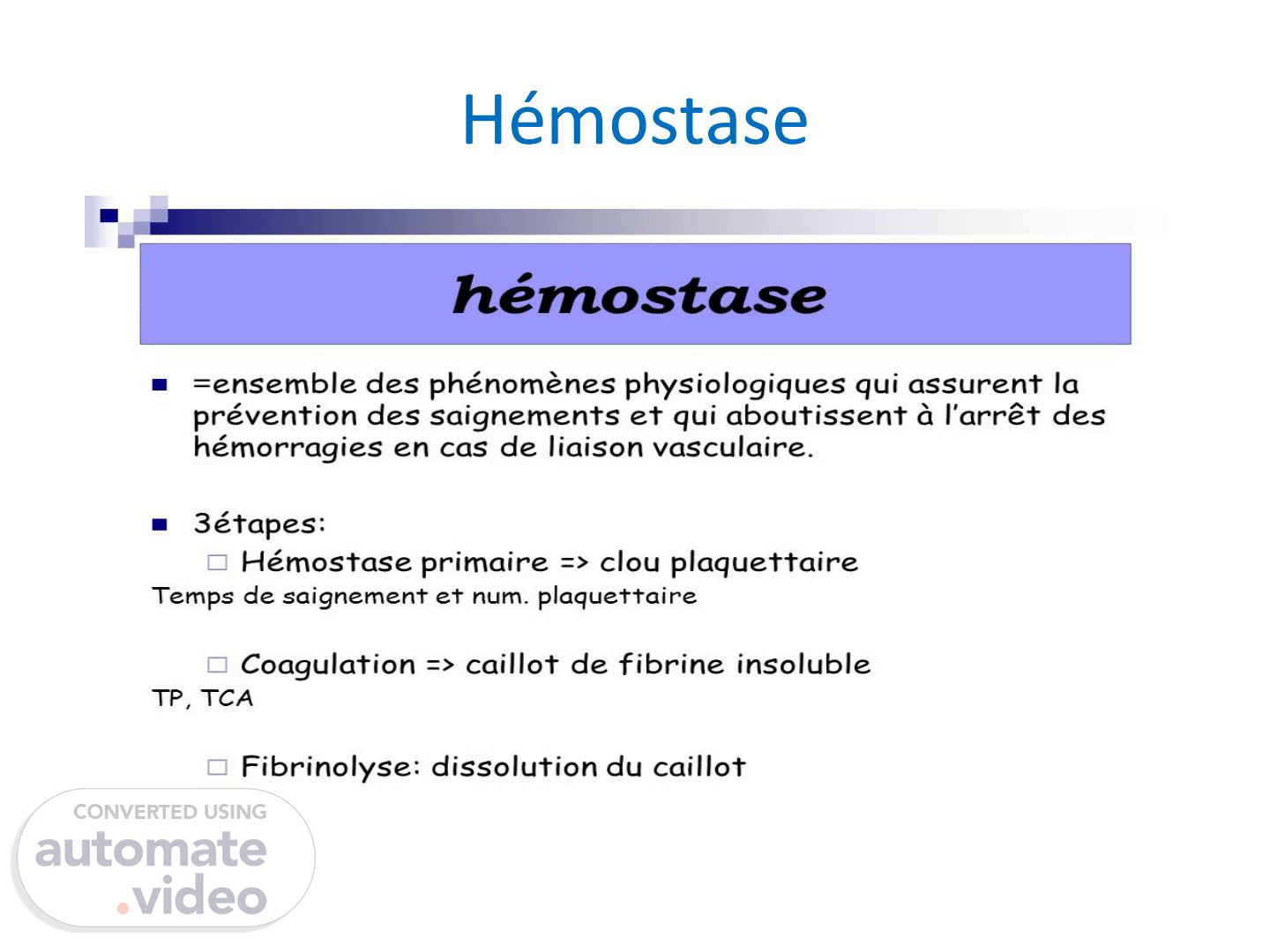 Hémostase Hémostase : cessation de l’écoulement du sang (4-3) Phases : 1e Phase : - Constriction – diminue le flot sanguin ii) 2 aPhase : - Thrombus blanc ii) 2b Phase: - Thrombus rouge-caillot iv) 3e Phase: - Dissolution.