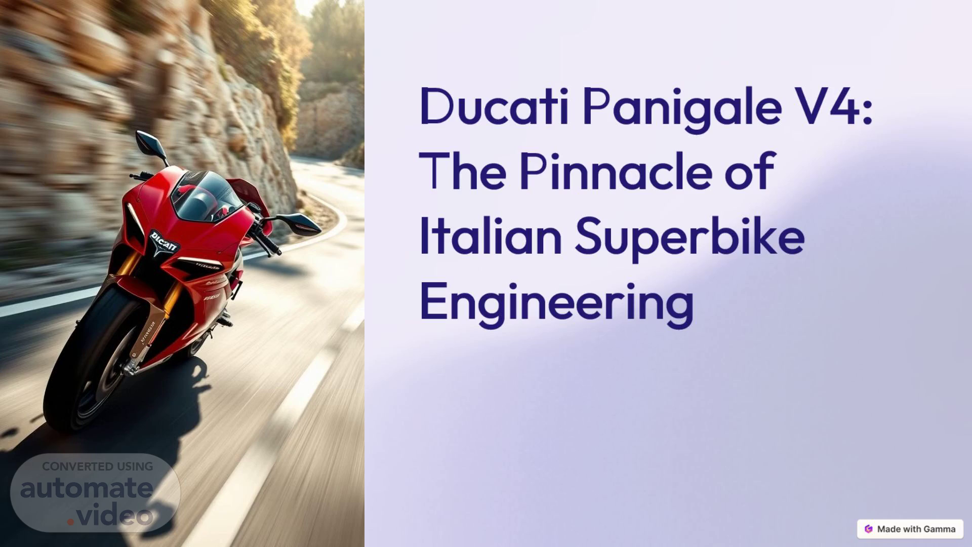 [Audio] We are thrilled to present the Ducati Panigale V4, a masterpiece of Italian engineering that embodies the spirit of performance and design that has made Ducati a legend in the world of motorcycles. This bike represents the pinnacle of Italian superbike engineering. With its sleek design, powerful engine, and state-of-the-art technology, it is the ultimate expression of Ducati's commitment to excellence. Whether you're a seasoned rider or just starting out, the Ducati Panigale V4 is the perfect choice for anyone who wants to experience the thrill of riding like a pro. With its cutting-edge features and unrivaled performance, this bike is sure to impress even the most discerning riders. So come join us and discover the Ducati Panigale V4, the ultimate expression of Italian superbike engineering..