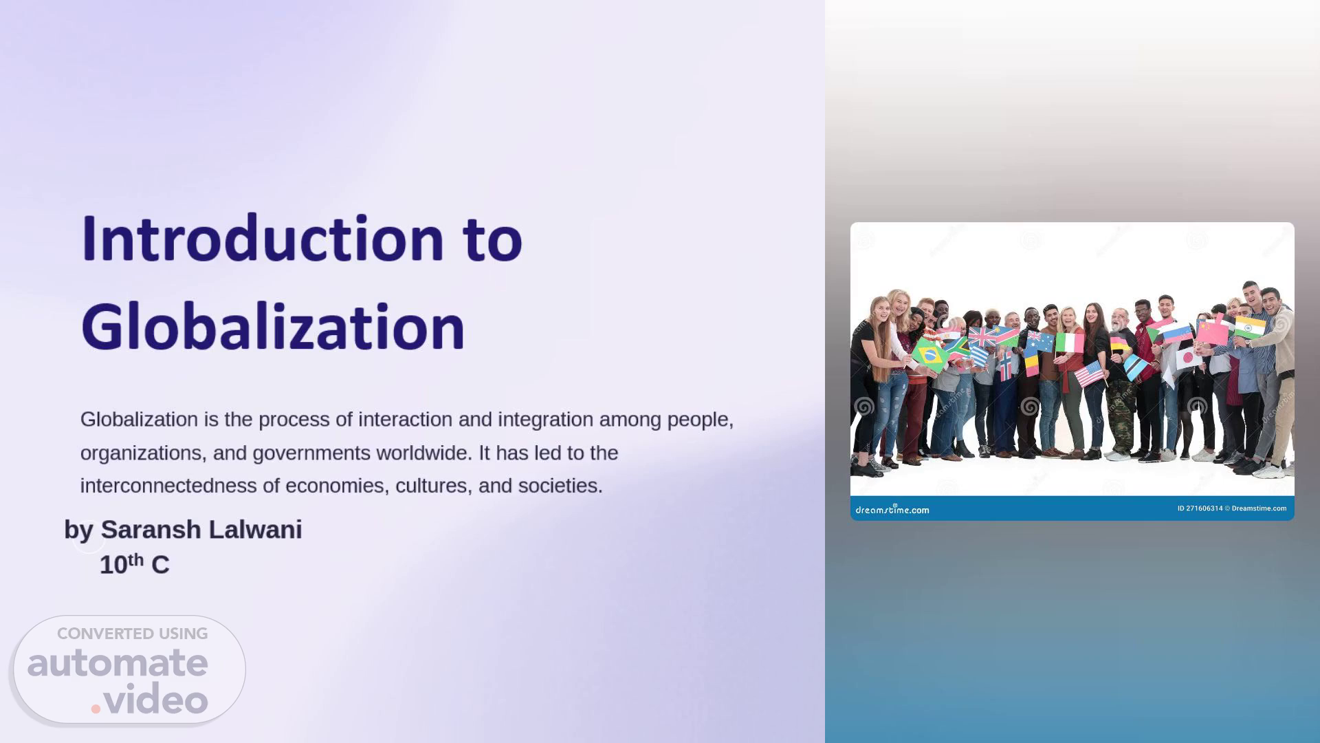 [Audio] Introduction to Globalization Globalization is the process of interaction and integration among people organizations and governments worldwide. It has led to the interconnectedness of economies cultures and societies. by Saransh Lalwani 10th C.