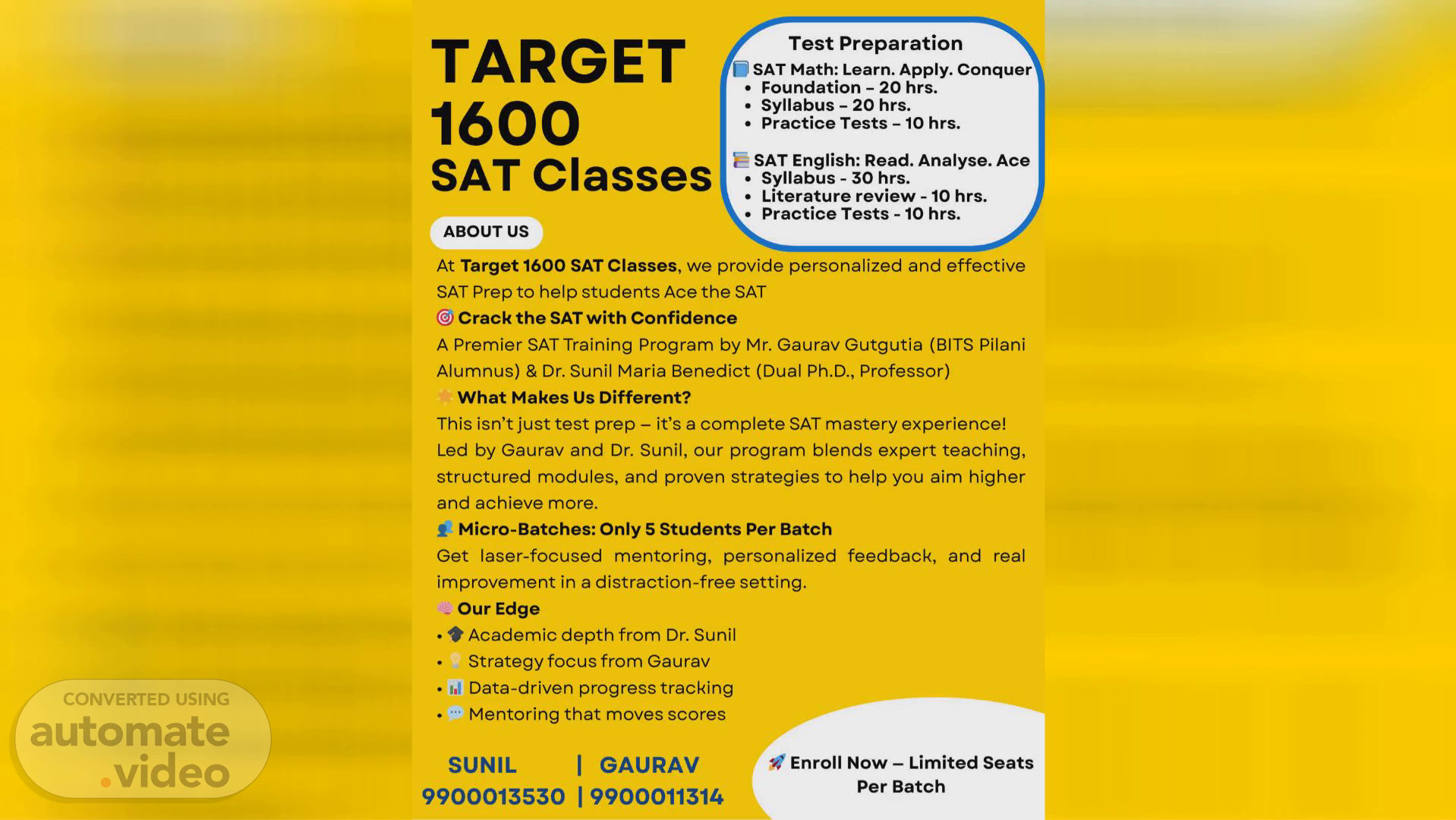 [Audio] Join Mr. Gaurav for expert Maths coaching and Dr. Sunil for powerful English strategies ā in a comprehensive SAT training program designed for top scores! š Proven methods š§ Concept clarity š Full-length practice tests šÆ Score-focused approach ⨠Let your SAT prep be guided by experience and results. š Limited seats | Enroll now!.