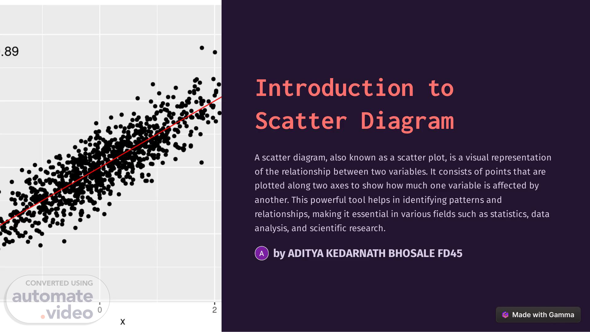 [Audio] Introduction to Scatter Diagram A scatter diagram, also known as a scatter plot, is a visual representation of the relationship between two variables. It consists of points that are plotted along two axes to show how much one variable is affected by another. This powerful tool helps in identifying patterns and relationships, making it essential in various fields such as statistics, data analysis, and scientific research. by ADITYA KEDARNATH BHOSALE FD45.