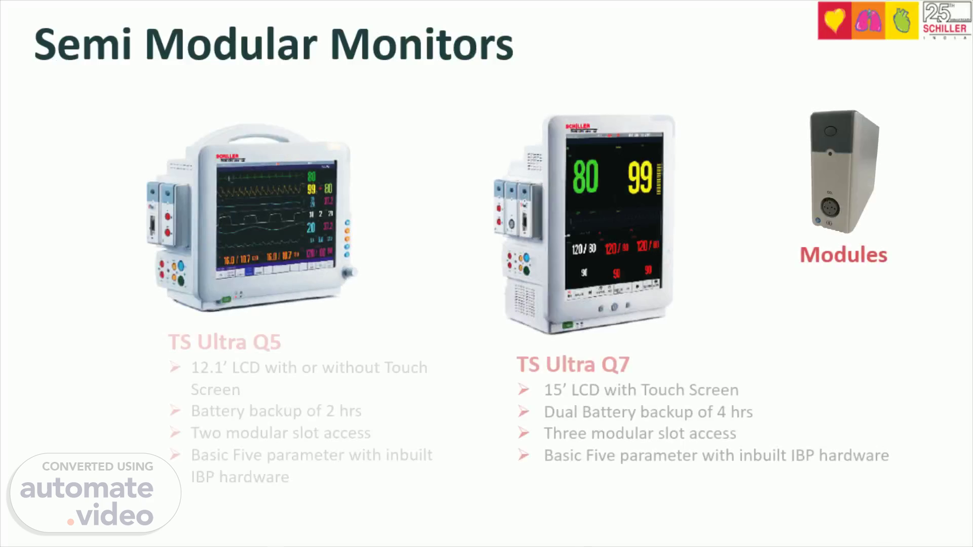 abstract. 80 99. TS Ultra Q7 15’ LCD with Touch Screen Dual Battery backup of 4 hrs Three modular slot access Basic Five parameter with inbuilt IBP hardware.
