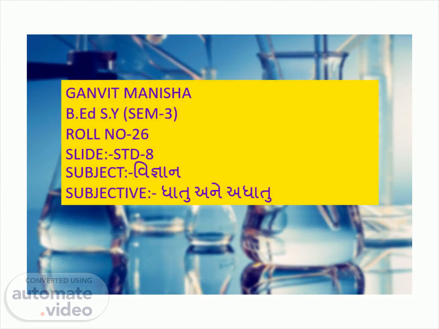 GANVIT MANISHA B.Ed S.Y (SEM-3) ROLL NO-26 SLIDE:-STD-8 SUBJECT:- વિજ્ઞાન SUBJECTIVE:- ધાતુ અને અધાતુ.