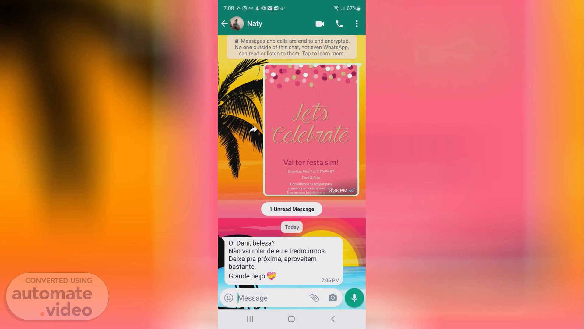 7:08 7 Naty a Messages and calls are end-to-end encrypted. No one outside of this chat, not even WhatsApp, can read or listen to them. Tap to learn more. Vai ter festa sim! Saturday May 7 at PM ET Dani & Alex Convidamos os Migos para comemorar nosso amversa 6±38 PM U Tragam suas bebidinh.v 1 Unread Message Today Oi Dani, beleza? Näo vai rolar de eu e Pedro irmos. Deixa pra proxima, aproveitem bastante. Grande beijo 7:06 PM @ Message o.
