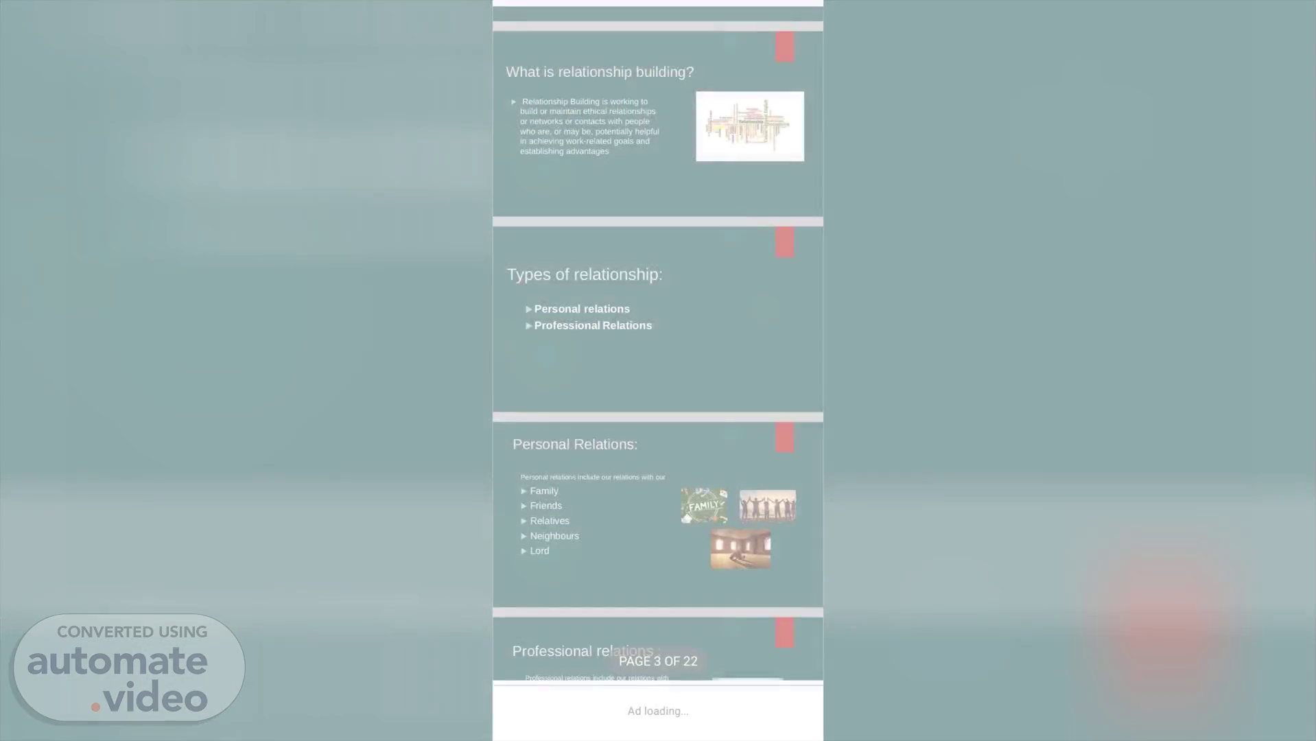 [Audio] . What is relationship building? Relationship Building is working to build or maintain ethical relationships or networks or contacts with people who are. or may be. potentially helpful in achieving work-related goals and establishing advantages. Types of relationship: Personal relations Professional Relations Personal Relations: Personal relaticms incliÄe our relabons wdh ow Family Friends Relatives Neighbours Lord Professional refaÅiO&ÉSg OF 22 Ad loading....