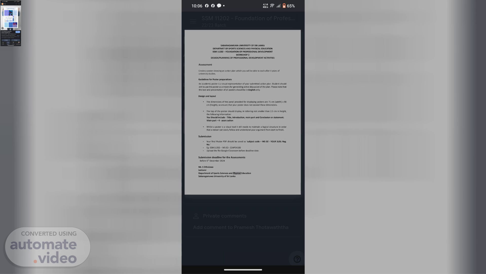 10:06 65% SABARAGAMUWA UNIVERSITY OV DEPARTMET OF SPORTS AND SSM 11202 - FOUNDATION OF PROFESSIONAL O WORKSHOP 2 OF PROFESSONAL [EVE LOP" ENT ACTIVITIES Create a plan win be of An poster is a of sutmitted Student aim to the and of all in Enøish The displaying TS cm Width) ( t Ni'htl The top the in than in he$'t, ttæ - Title, main stat—t. Main - 4 - WMst a it maintain a logica in a on and urdeßtand start to fish. ission Eg: - WS 02- 22APS4LOO tile GO%le date. Submission deadline for the Assessments Before 2024 Mr. S mhalawa of SW-ts Saba of n - WS 02 - rouR Sust Reg..