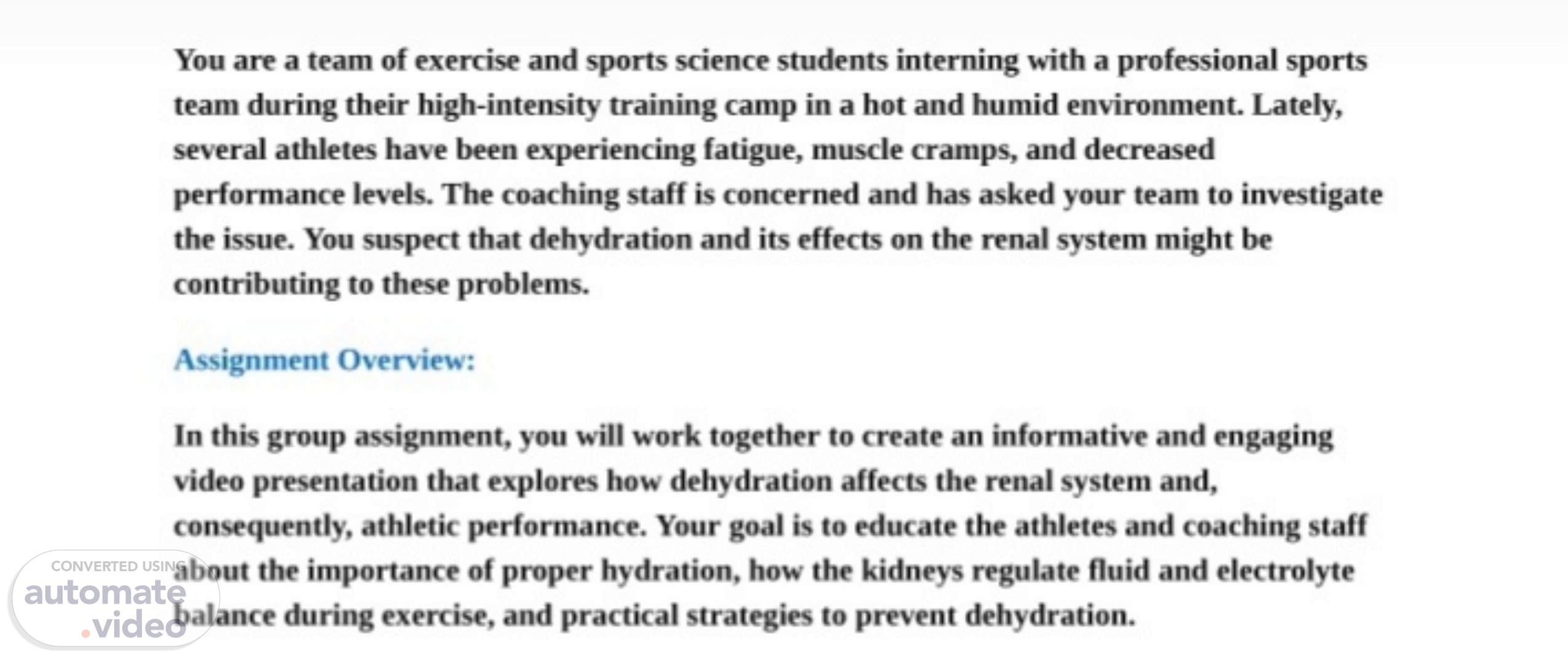 [Audio] . You are a team of exercise and sports science students interning with a professional sports team during their high-intensity training camp in a hot and humid environment. Lately, several athletes have been experiencing fatigue, muscle cramps, and decreased performance levels. The coaching staff is concerned and has asked your team to investigate the issue. You suspect that dehydration and its effects on the renal system might be contributing to these problems. Assignment Overview: In this group assignment, you will work together to create an informative and engaging video presentation that explores how dehydration affects the renal system and, consequently, athletic performance. Your goal is to educate the athletes and coaching staff about the importance of proper hydration, how the kidneys regulate fluid and electrolyte balance during exercise, and practical strategies to prevent dehydration..