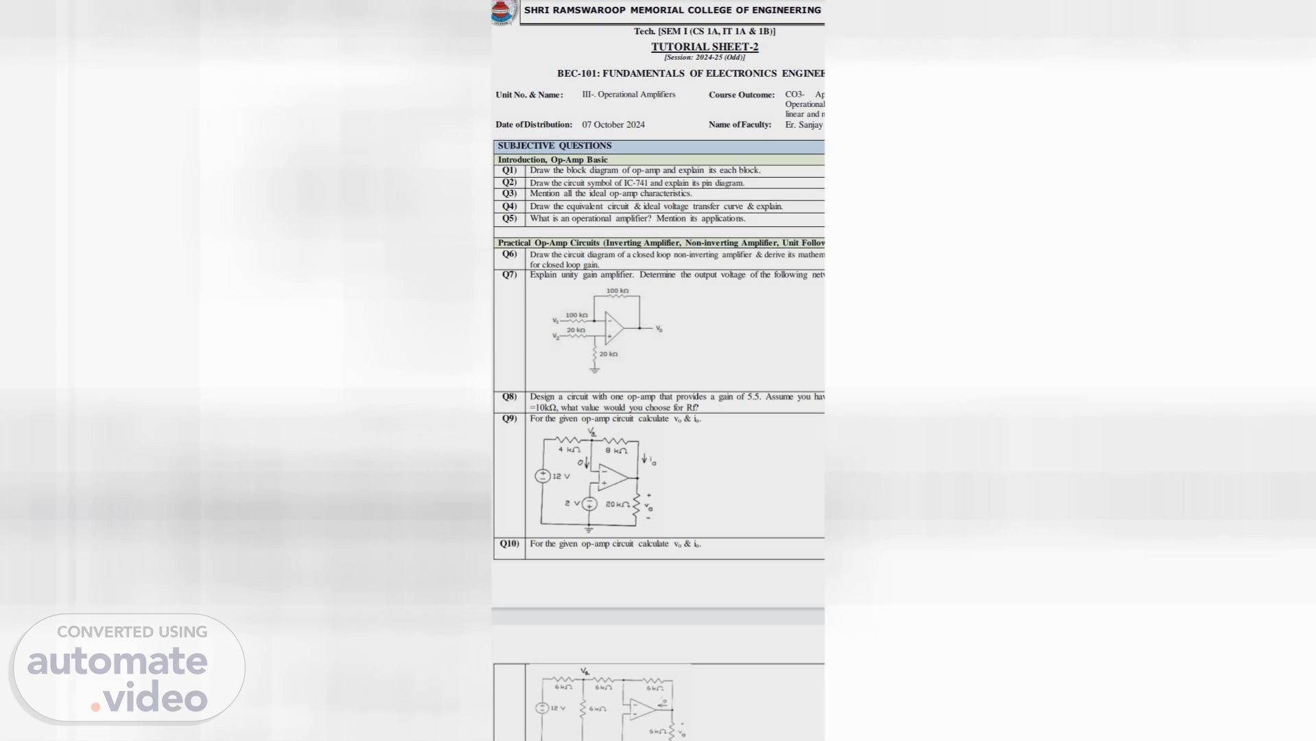 9) SHRI RAMSWAROOP MEMORIAL COLLEGE OF ENGINEERING Tech. [SEM 1 (CS IA, rr IA & 1B)) TUTORIAL SHEET-2 Ise„ion: 2024-2s {Odd)/ BEC-IOI: FUNDAMEMALS OF ELECTRONICS ENGLNM Unit No. & Name: Ill-. Orxratbnal Amplifiers Date ormstribution: 07 October 2024 SUBJECIWE QUESTIONS Introduction, A Bas ic Course Outcome: Name or Faculty: C03- Ar Operational har atul n Er. Sanjay QI) Draw tlr b kkk diagram o f op- anv and explain Ws each bkw•k. Q2) Draw the circuit symtv»l Of IC-741 and explam its dia m. Q3) Mention all tlw ideal op- anp charac terist i's. 04) Draw tlr e t circuit & ideal vohage tralßK•r ctne & e xphin. Q5) What is an operatinul amplifier? Mention its ap Practical A Cin•uits (Inve A r, Non-inve r, Unit Follow Q9) QIO) Draw the circuit dklgram of a ck)sed loop non-inverting amplifær & (krive is mathem for cbsed Evphin uniy gain Detern-iJE output vouage of tte folhwing 100 kn Design a circui with op•an» tlut proviles a gain 0 5.5. Assune you = I OkQ , WI-at value Wouk] u choose fo r R f? For tle given op•anv circui cakuklte vo & _ 12 v For tlr given op-anv circuit calculate & v. 12 v.
