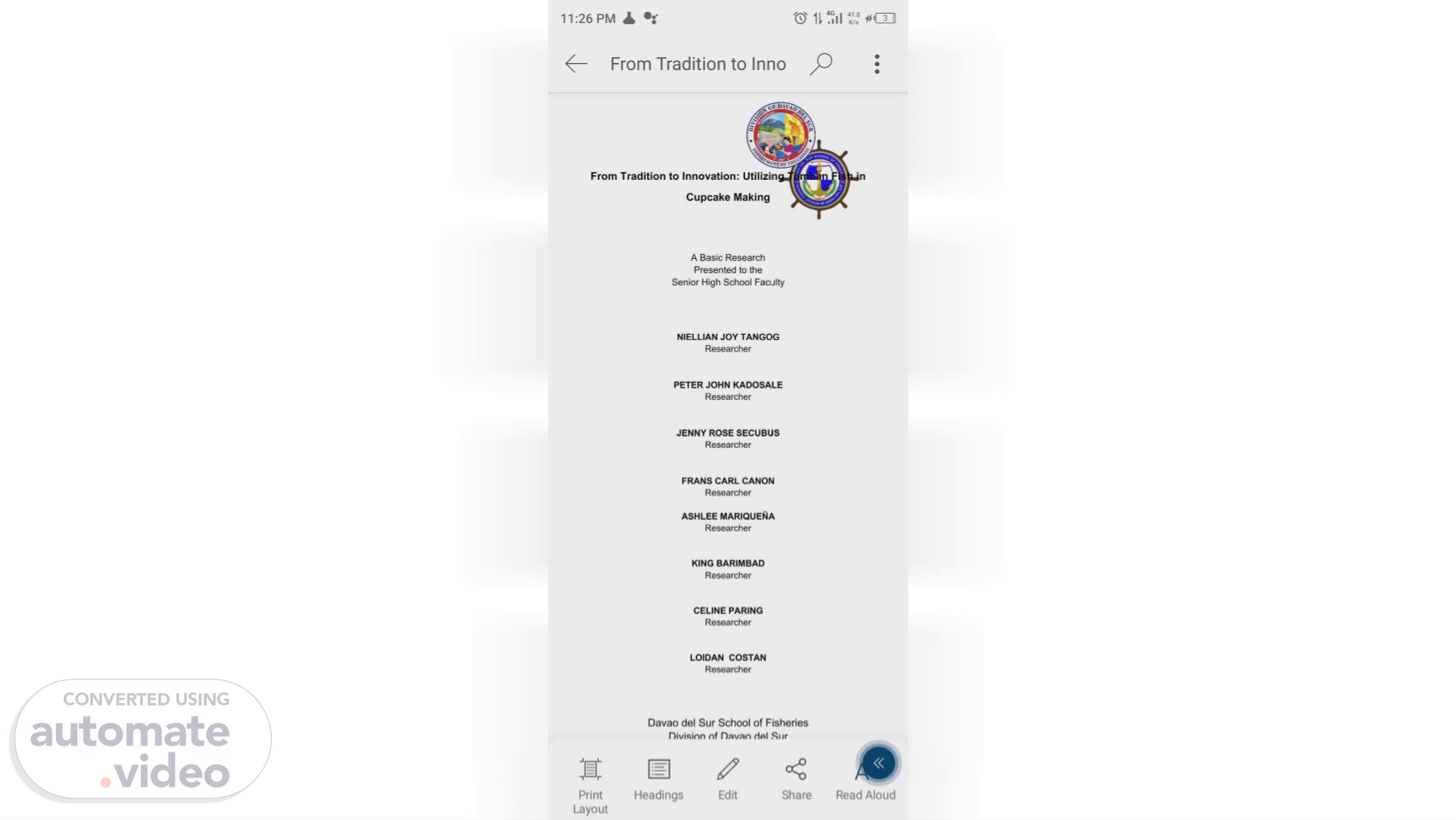 11:26 PM •S e From Tradition to Inno From Tradition to Innovation: Utilizin Cupcake Making A Basic Research Presented to the Senior High School Faculty NIELLIAN JOY TANGOG Researcher PETER JOHN KADOSALE Researcher JENNY ROSE SECUBUS Researcher FRANS CARL CANON Researcher ASHLEE MARIQUENA Researcher KING BARIMBAD Researcher CELINE PARING Researcher LOIDAN COSTAN Researcher Davao del Sur School of Fisheries Division nf del 4G print Layout Headings Edit Share Read Aloud.