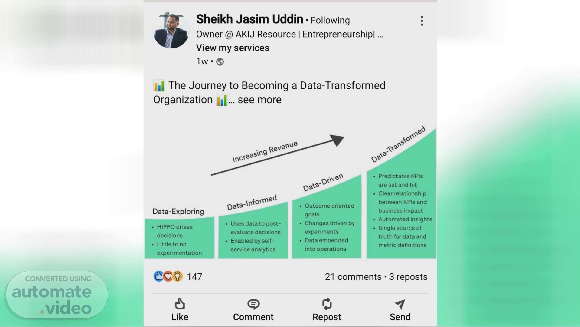 Sheikh Jasim Uddin • Following Owner @ AKIJ Resource I Entrepreneurshipl . View my services lw•O The Journey to Becoming a Data-Transformed Organization see more O€«eo Data-Exploring • HIPPO drives decisions • Little to no experimentation 147 Like Revenue \ n creasing Data-informed • Uses data to post- evaluate decisions • Enabled by self- service analytics Comment Outcome oriented • goals Changes driven by • experiments • Data embedded into operations • Predictable KPIs are set and hit • Clear relationship between KPIs and business impact • Automated insights • Single source of truth for data and metric definitions 21 comments • 3 reposts Repost Send.
