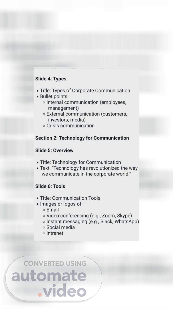 [Audio] . Slide 4: Types • Title: Types of Corporate Communication • Bullet points: o Internal communication (employees, management) o External communication (customers, investors, media) o Crisis communication Section 2: Technology for Communication Slide 5: Overview • Title: Technology for Communication • Text: "Technology has revolutionized the way we communicate in the corporate world." Slide 6: Tools • Title: Communication Tools • Images or logos of: o Email o Video conferencing (e.g., Zoom, Skype) o Instant messaging (e.g., Slack, WhatsApp) o Social media o Intranet.