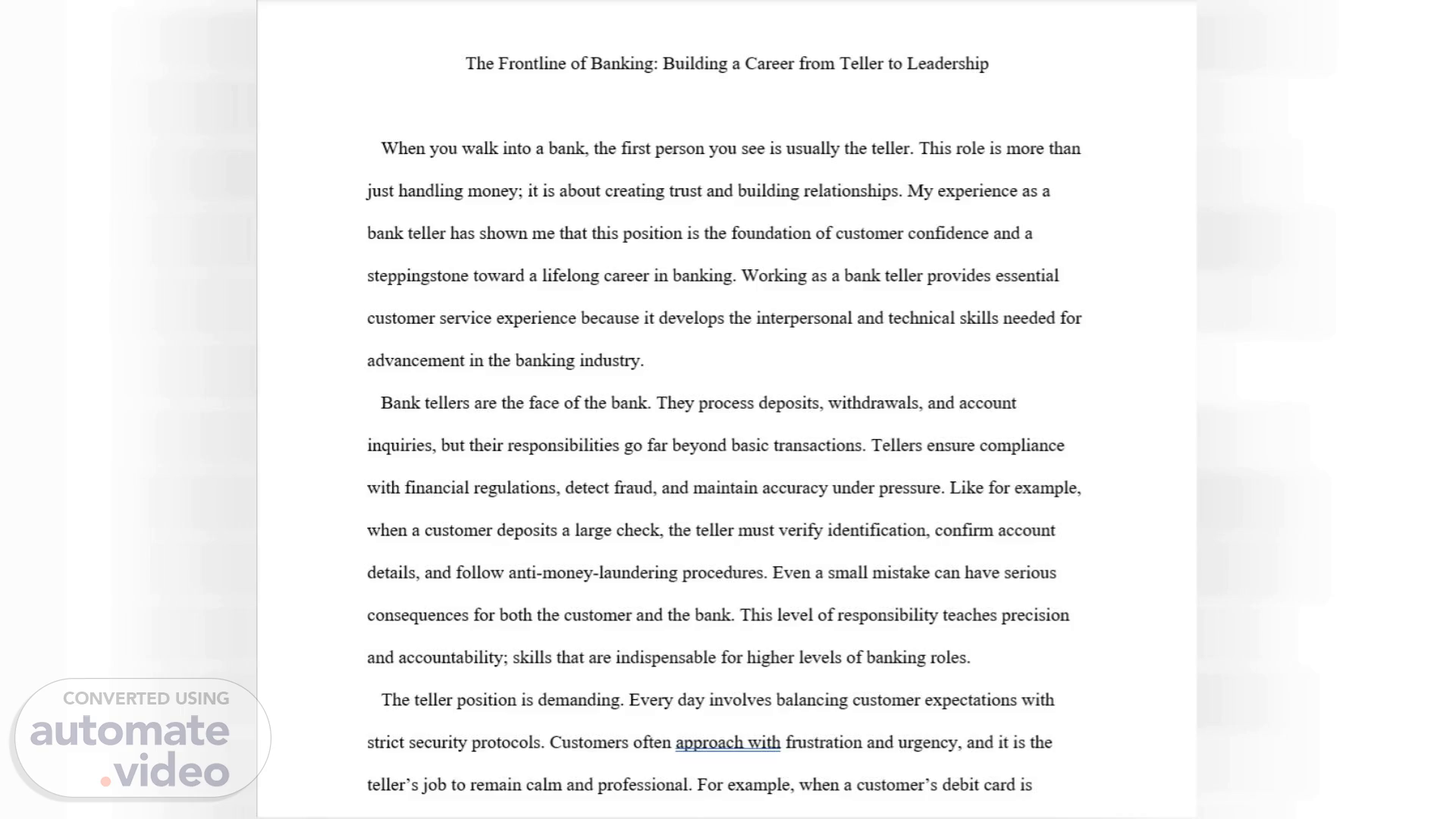[Audio] . The Frontline of Banking: Building a Career from Teller to Leadership When you walk into a bank, the first person you see is usually the teller. This role is more than just handling money; it is about creating trust and building relationships. My experience as a bank teller has shown me that this position is the foundation of customer confidence and a steppingstone toward a lifelong career in banking. Working as a bank teller provides essential customer service experience because it develops the interpersonal and technical skills needed for advancement in the banking industry. Bank tellers are the face of the bank. They process deposits, withdrawals, and account inquiries, but their responsibilities go far beyond basic transactions. Tellers ensure compliance with financial regulations, detect fraud, and maintain accuracy under pressure. Like for example, when a customer deposits a large check, the teller must verifr identification, confirm account details, and follow anti-money-laundering procedures. Even a small mistake can have serious consequences for both the customer and the bank. This level of responsibility teaches precision and accountability; skills that are indispensable for higher levels of banking roles. The teller position is demanding. Every day involves balancing customer expectations with strict security protocols. Customers often fi-ustration and urgency, and it is the teller's job to remain calm and professional. For example, when a customer's debit card is.