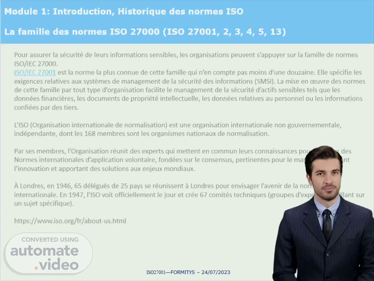 [Virtual Presenter] Les organisations cherchent constamment des moyens pour protéger leurs informations sensibles et les garder en sécurité. La famille de normes ISO/IEC 27000 peut leur offrir ce dont elles ont besoin pour atteindre ce but. ISO/IEC 27001 est la norme la plus reconnue et elle établit les exigences relatives aux systèmes de management de la sécurité des informations. Les autres normes de cette famille fournissent aux organisations des lignes directrices supplémentaires pour gérer leur sécurité. Les normes peuvent être utilisées pour sécuriser des informations aussi variées que des données financières, des propriétés intellectuelles, des données concernant le personnel ou des informations fournies par des tiers. L'ISO est une organisation internationale indépendante dont le but est de fournir des normes pour assurer la sécurité des informations sensibles. Elle a été fondée en 1946 par 65 délégués de 25 pays réunis à Londres. Actuellement, l'ISO est composée de 168 membres représentant des organismes nationaux de normalisation. Ils mettent leurs connaissances en commun afin de développer des normes internationales d'application volontaire pour soutenir l'innovation et résoudre les problèmes mondiaux..