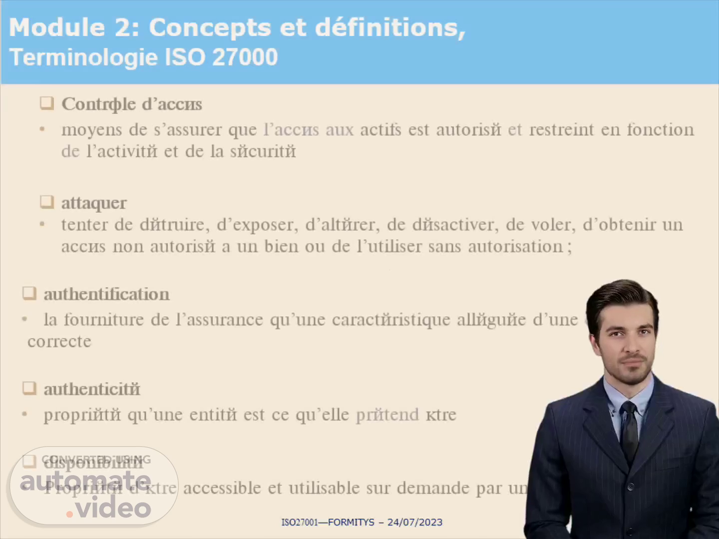 [Audio] Le contrôle d'accès vise à assurer la protection des actifs et est caractérisé par l'authentification, l'authenticité et la disponibilité, conformément aux normes ISO 27000. La confidentialité des informations permet de protéger leur utilisation par des personnes et des entités non autorisées. La conformité s'assure que les obligations et leurs conséquences sont respectées. Ces conséquences sont le résultat d'un événement qui peut affecter les objectifs définis et produire des effets négatifs amplifiés..