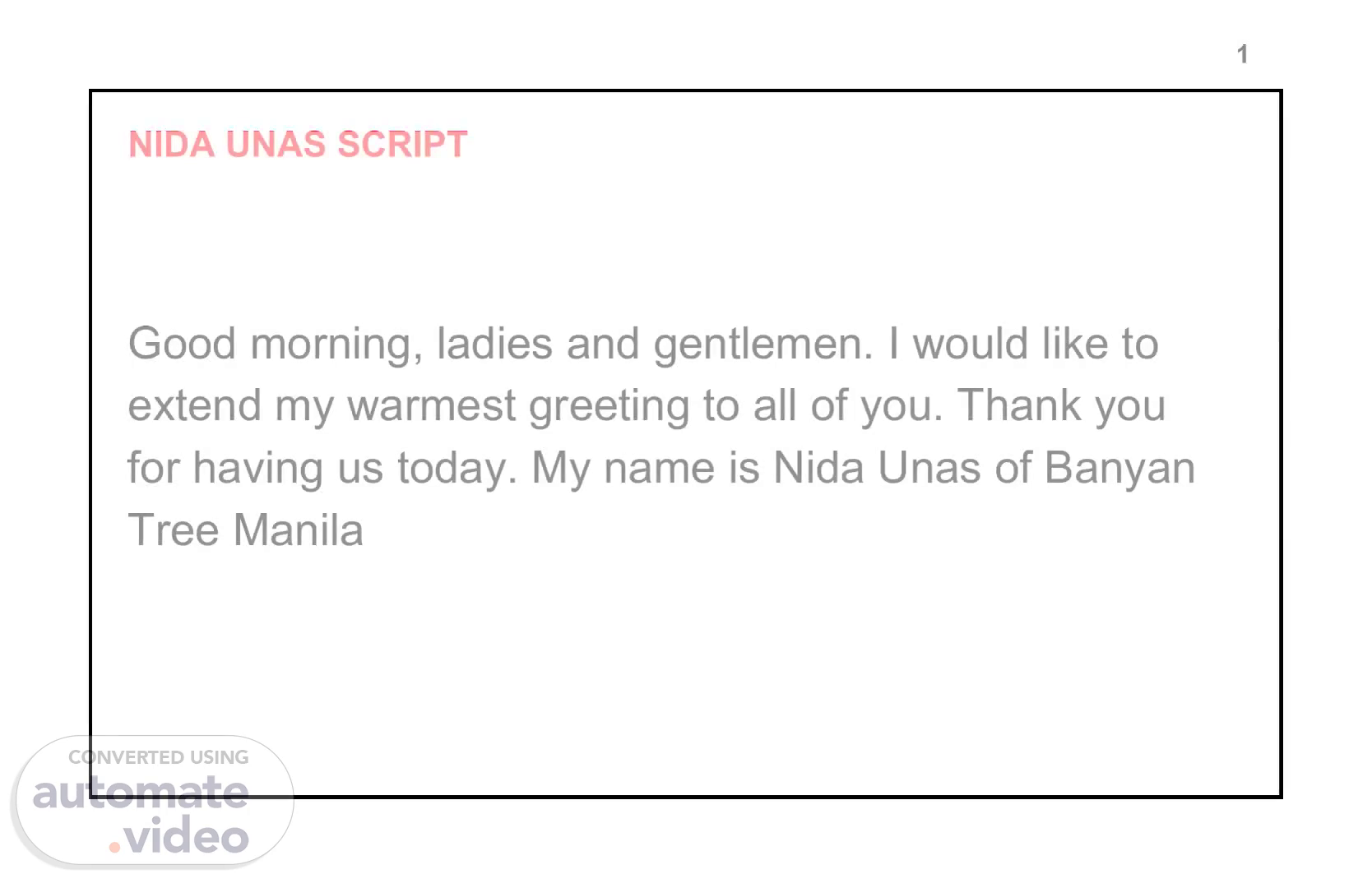 [Virtual Presenter] Good morning, ladies and gentlemen. I would like to extend my warmest greeting to all of you. Thank you for having us today. My name is Nida Unas of Banyan Tree Manila NIDA UNAS SCRIPT 1.