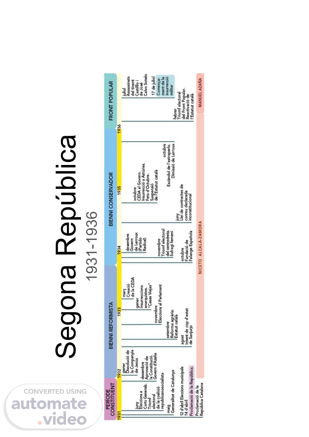 Segona Repüblica 1931-1936 CONSTITUENT 1931 1932 &ssolud6 de la Companyia de Jesus desernbre BIENNI REFORMISTA 1933 marf de la CEDA Insurreccions anarquistes. • Casas Eleccions PulameM Reforma griria. EstatLR catala Intet de cop d'estat Sarüurp 1934 & *rnbre Govern (Partido Triomf electoral del centred"ta. octubre de Espaiola BIENNI CONSERVADOR 1935 CEDA al Govern. Insurrecciö a Fets d'Oct1bre. *sextout octubre Escindol l' estrap«lo. Dünissiö Lerroux • de contractes de conreu declarada 1936 Cons G«.rak. Apr ovaciö de Triomf la Constituciö. electoral de coalicié republicanosocialista maig Gmeralitat Catalmya 12 Eleceu rn*als 14 d'abrd Prodamaci6 la R.üHica: Prodamaci6 de la NICETO ALCALÅ-ZAMORA FRONT POPULAR del tinert Castillo i de Joé Calvo Stdo 17 juhol Comensa- rnent de la insurrecciö T riomf electoral Front p Reactivxiö I •EstatLR MANUEL AZAAA.