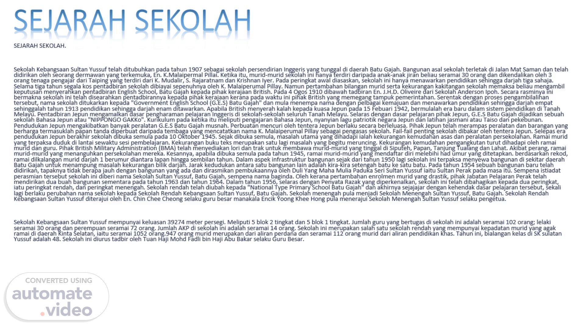 [Audio] Sekolah Kebangsaan Sultan Yussuf adalah sekolah Inggeris persendirian yang pertama di daerah Batu Gajah yang didirikan pada tahun 1907. Ia ditubuhkan oleh seorang dermawan terkenal En. K.Malaipermal Pillai. Awalnya sekolah ini hanya menawarkan pendidikan sampai darjah tiga dan biayanya dibiayai sepenuhnya oleh beliau. Namun pertambahan bilangan murid dan kekurangan kakitangan memaksa pihak beliau untuk memindahkan pentadbiran Sekolah Inggeris Batu Gajah kepada pihak kerajaan British. Pada 4 Ogos 1910 pengambilalihan tersebut berjaya dilakukan dan ia kini dikenali sebagai Sekolah Kebangsaan Sultan Yussuf. Walaupun sekolah ini dirintis dengan kekurangan kemudahan dan kakitangan pelajar di Sekolah Kebangsaan Sultan Yussuf sentiasa berusaha untuk berjaya..