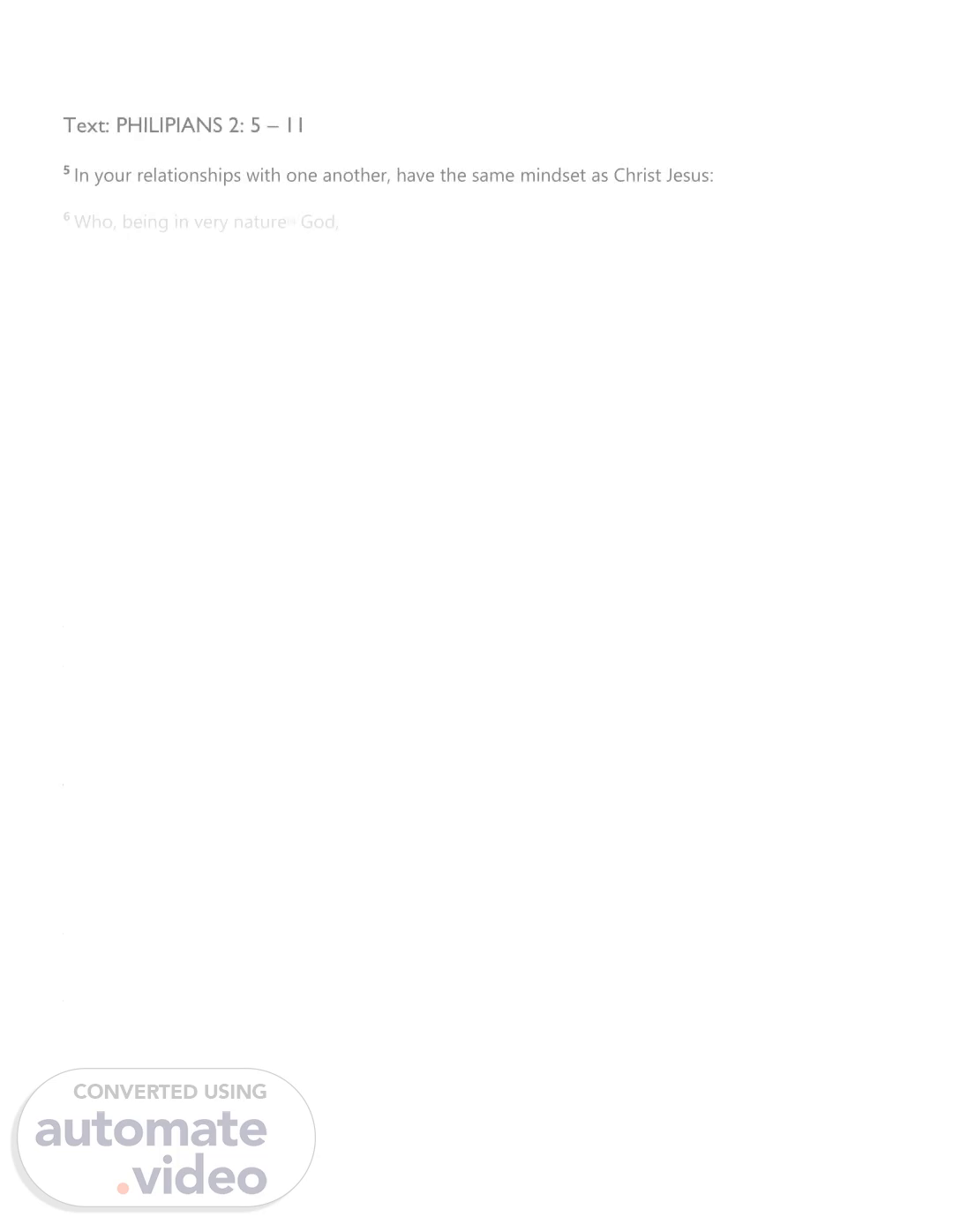 [Audio] Today, let us take the time to reflect upon the humble and selfless attitude Jesus displayed throughout his earthly ministry. He, being fully God, chose to humble himself by taking on the form of a servant, human in likeness. He allowed himself to be obedient, even to the point of death on the cross. It is through this attitude of self-sacrifice and humility that God exalted him to the highest place. As Christians, we should strive to emulate Jesus' example and strive for unity through a mindset of humility, respect, and sacrificial love. We can do this by cultivating an attitude of servanthood in our everyday lives and relationships..
