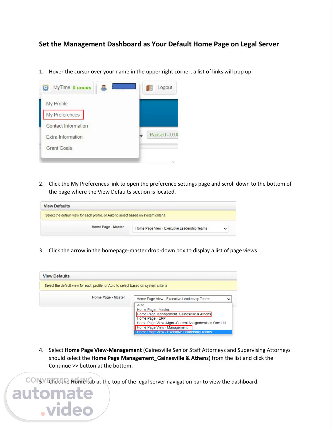 [Audio] Set the Management Dashboard as Your Default Home Page on Legal Server 1. Hover the cursor over your name in the upper right corner, a list of links will pop up: 2. Click the My Preferences link to open the preference settings page and scroll down to the bottom of the page where the View Defaults section is located. 3. Click the arrow in the homepage-master drop-down box to display a list of page views. 4. Select Home Page View-Management (Gainesville Senior Staff Attorneys and Supervising Attorneys should select the Home Page Management_Gainesville & Athens) from the list and click the Continue >> button at the bottom. 5. Click the Home tab at the top of the legal server navigation bar to view the dashboard..