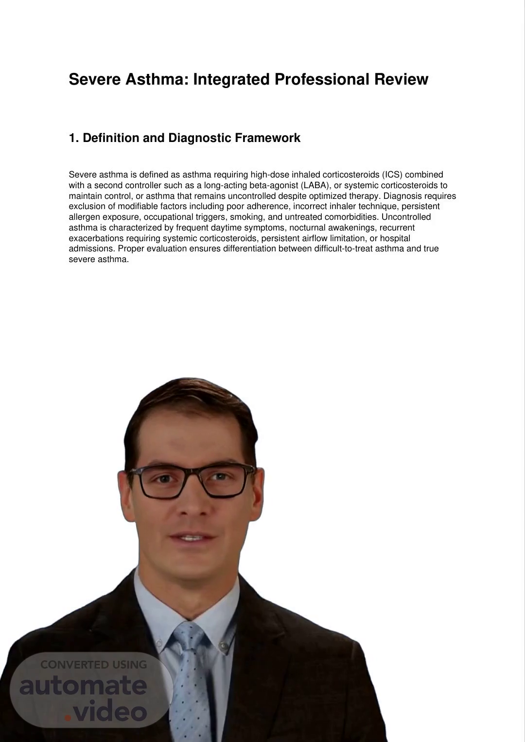 [Virtual Presenter] In severe asthma, patients often require high doses of inhaled corticosteroids combined with other medications like long-acting beta agonists or systemic corticosteroids to control their symptoms. Patients who experience uncontrolled symptoms despite optimal treatment may also be classified as having severe asthma. To make an accurate diagnosis, several factors must be excluded from consideration, including non-adherence to treatment, improper use of inhalers, continued exposure to allergens, occupational hazards, smoking, and untreated health conditions. Once these factors have been ruled out, the focus shifts to identifying characteristic symptoms of uncontrolled asthma, such as frequent daytime symptoms, nighttime awakenings, repeated episodes of worsening symptoms, persistent airflow limitations, or hospitalizations. A thorough evaluation is necessary to distinguish between difficult-to-treat asthma and truly severe asthma..