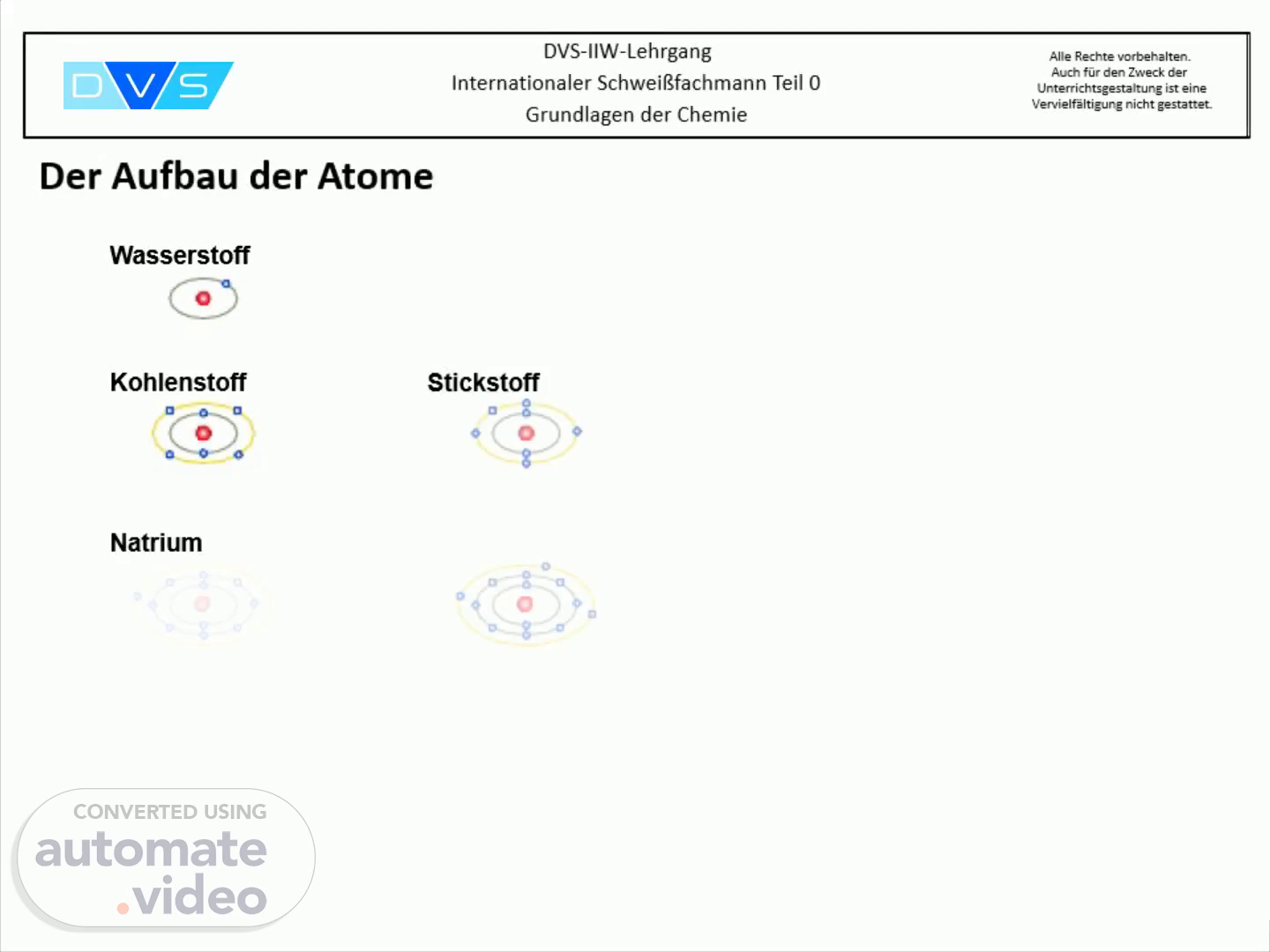 DVS-IIW-Lehrgang Alle Rechte vorbehalten. Auch für den Zweck der Unterrichtsgestaltung ist eine Vervielfältigung nicht gestattet. Internationaler Schweißfachmann Teil 0 Grundlagen der Chemie Der Aufbau der Atome.