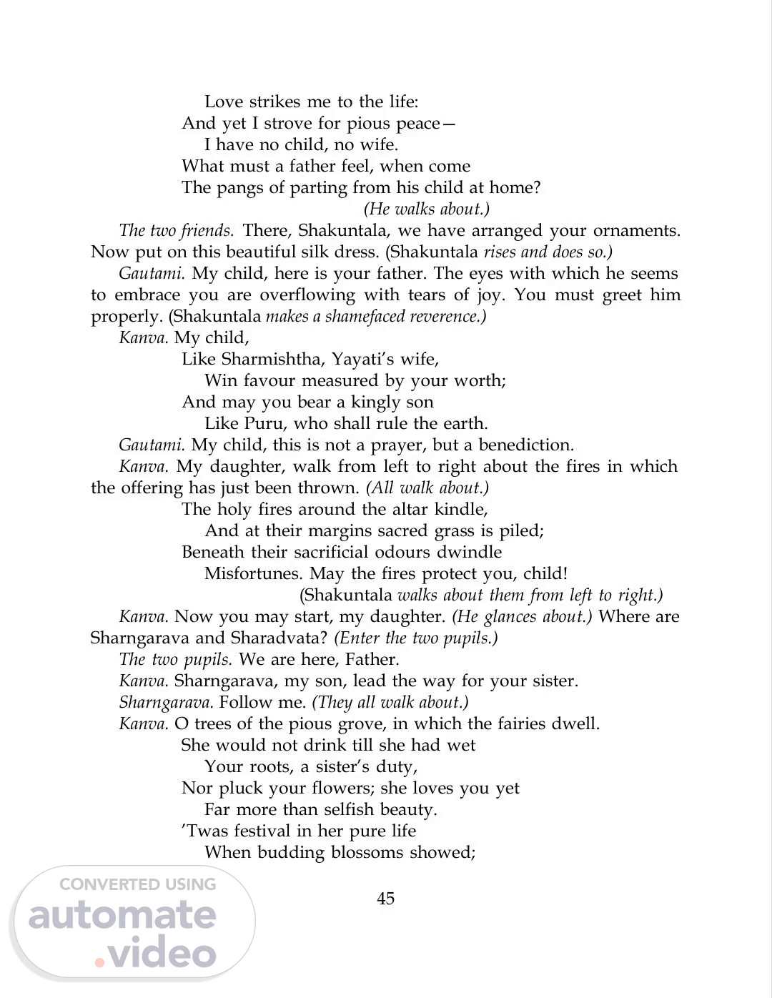 Love strikes me to the life: And yet I strove for pious peaceÑ I have no child, no wife. What must a father feel, when come The pangs of parting from his child at home? (He walks about.) The two friends. There, Shakuntala, we have arranged your ornaments. Now put on this beautiful silk dress. (Shakuntala rises and does so.) Gautami. My child, here is your father. The eyes with which he seems to embrace you are overflowing with tears of joy. You must greet him properly. (Shakuntala makes a shamefaced reverence.) Kanva. My child, Like Sharmishtha, YayatiÕs wife, Win favour measured by your worth; And may you bear a kingly son Like Puru, who shall rule the earth. Gautami. My child, this is not a prayer, but a benediction. Kanva. My daughter, walk from left to right about the fires in which the offering has just been thrown. (All walk about.) The holy fires around the altar kindle, And at their margins sacred grass is piled; Beneath their sacrificial odours dwindle Misfortunes. May the fires protect you, child! (Shakuntala walks about them from left to right.) Kanva. Now you may start, my daughter. (He glances about.) Where are Sharngarava and Sharadvata? (Enter the two pupils.) The two pupils. We are here, Father. Kanva. Sharngarava, my son, lead the way for your sister. Sharngarava. Follow me. (They all walk about.) Kanva. O trees of the pious grove, in which the fairies dwell. She would not drink till she had wet Your roots, a sisterÕs duty, Nor pluck your flowers; she loves you yet Far more than selfish beauty. ÕTwas festival in her pure life When budding blossoms showed; 45.