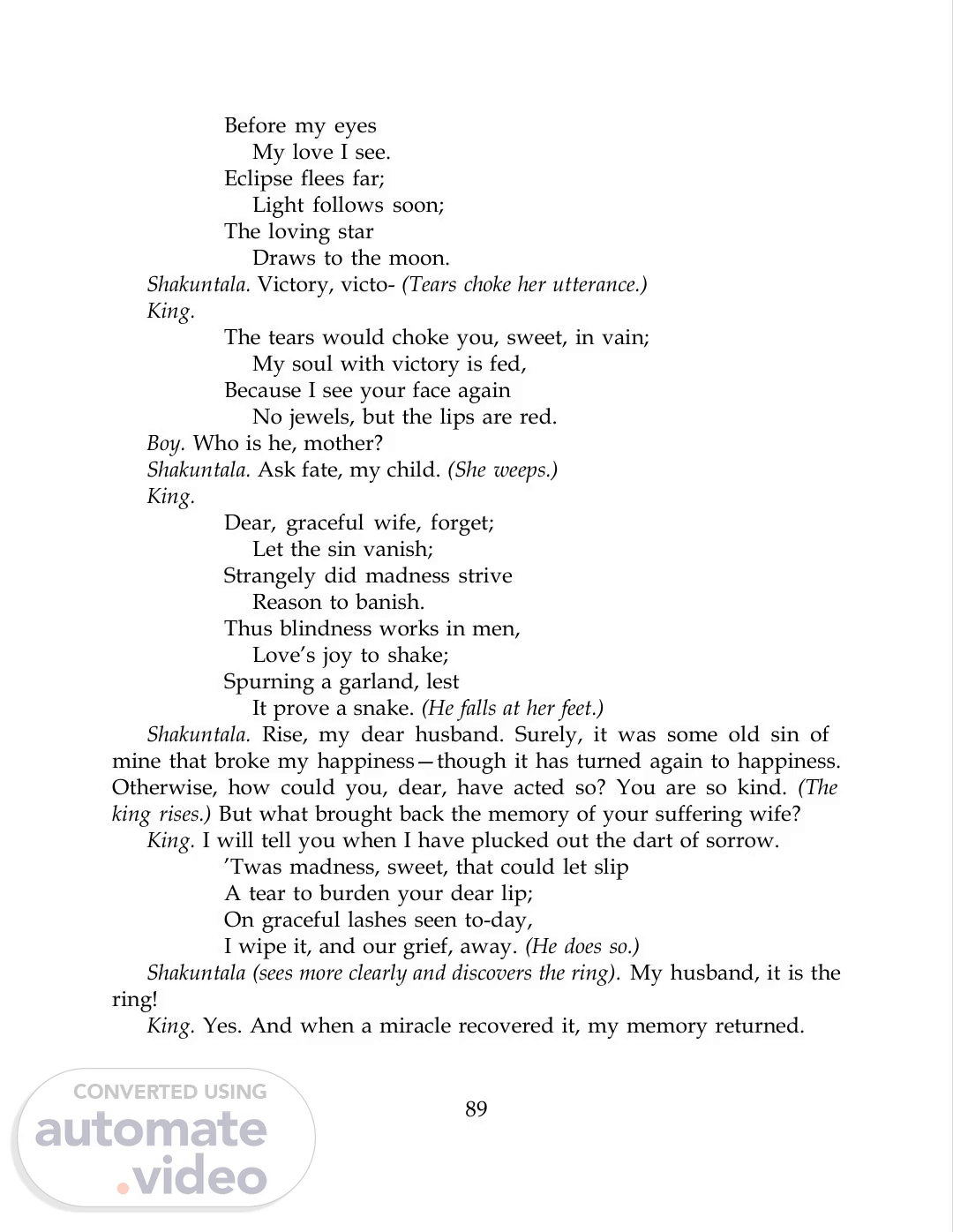 Before my eyes My love I see. Eclipse flees far; Light follows soon; The loving star Draws to the moon. Shakuntala. Victory, victo- (Tears choke her utterance.) King. The tears would choke you, sweet, in vain; My soul with victory is fed, Because I see your face again No jewels, but the lips are red. Boy. Who is he, mother? Shakuntala. Ask fate, my child. (She weeps.) King. Dear, graceful wife, forget; Let the sin vanish; Strangely did madness strive Reason to banish. Thus blindness works in men, LoveÕs joy to shake; Spurning a garland, lest It prove a snake. (He falls at her feet.) Shakuntala. Rise, my dear husband. Surely, it was some old sin of mine that broke my happinessÑthough it has turned again to happiness. Otherwise, how could you, dear, have acted so? You are so kind. (The king rises.) But what brought back the memory of your suffering wife? King. I will tell you when I have plucked out the dart of sorrow. ÕTwas madness, sweet, that could let slip A tear to burden your dear lip; On graceful lashes seen to-day, I wipe it, and our grief, away. (He does so.) Shakuntala (sees more clearly and discovers the ring). My husband, it is the ring! King. Yes. And when a miracle recovered it, my memory returned. 89.