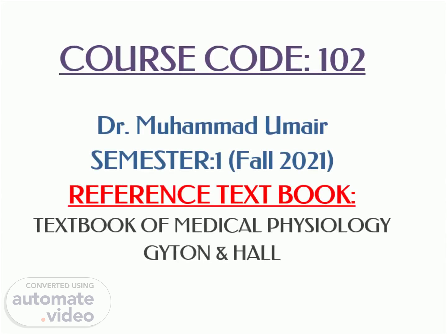 COURSE CODE: 102. Dr. Muhammad Umair SEMESTER:1 (Fall 2021) REFERENCE TEXT BOOK: TEXTBOOK OF MEDICAL PHYSIOLOGY GYTON & HALL.