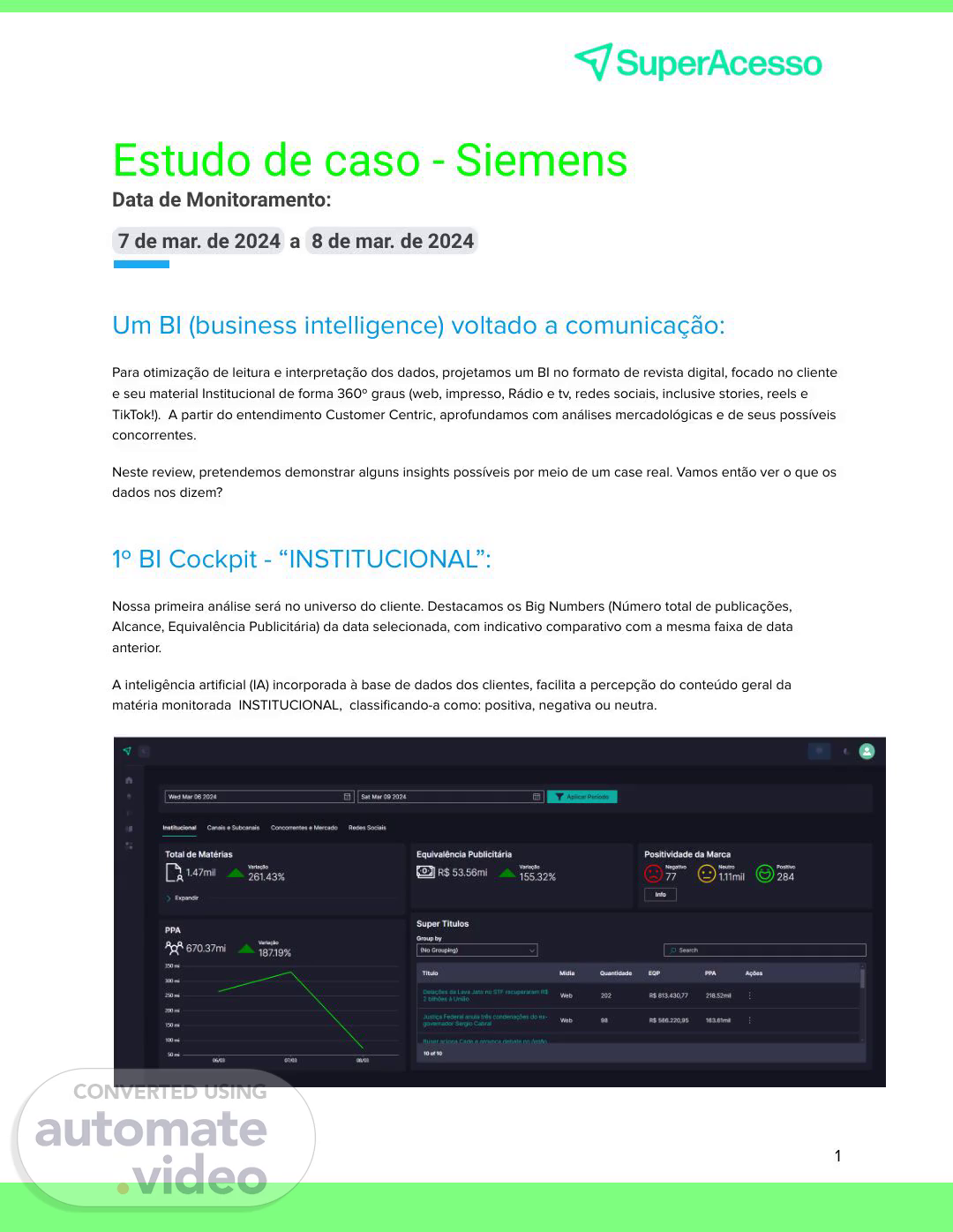 [Audio] Estudo de caso Siemens Data de Monitoramento: 7 de mar. de 2024 a 8 de mar. de 2024 Um (B-I ) (business intelligence) voltado a comunicação: Para otimização de leitura e interpretação dos dados, projetamos um (B-I ) no formato de revista digital, focado no cliente e seu material Institucional de forma 360º graus (web, impresso, Rádio e tv, redes sociais, inclusive stories, reels e TikTok!). A partir do entendimento Customer Centric, aprofundamos com análises mercadológicas e de seus possíveis concorrentes. Neste review, pretendemos demonstrar alguns insights possíveis por meio de um case real. Vamos então ver o que os dados nos dizem? 1º (B-I ) Cockpit “INSTITUCIONAL”: Nossa primeira análise será no universo do cliente. Destacamos os Big Numbers (Número total de publicações, Alcance, Equivalência Publicitária) da data selecionada, com indicativo comparativo com a mesma faixa de data anterior. A inteligência artificial (I-A---) incorporada à base de dados dos clientes, facilita a percepção do conteúdo geral da matéria monitorada INSTITUCIONAL, classificando a como: positiva, negativa ou neutra. 1.