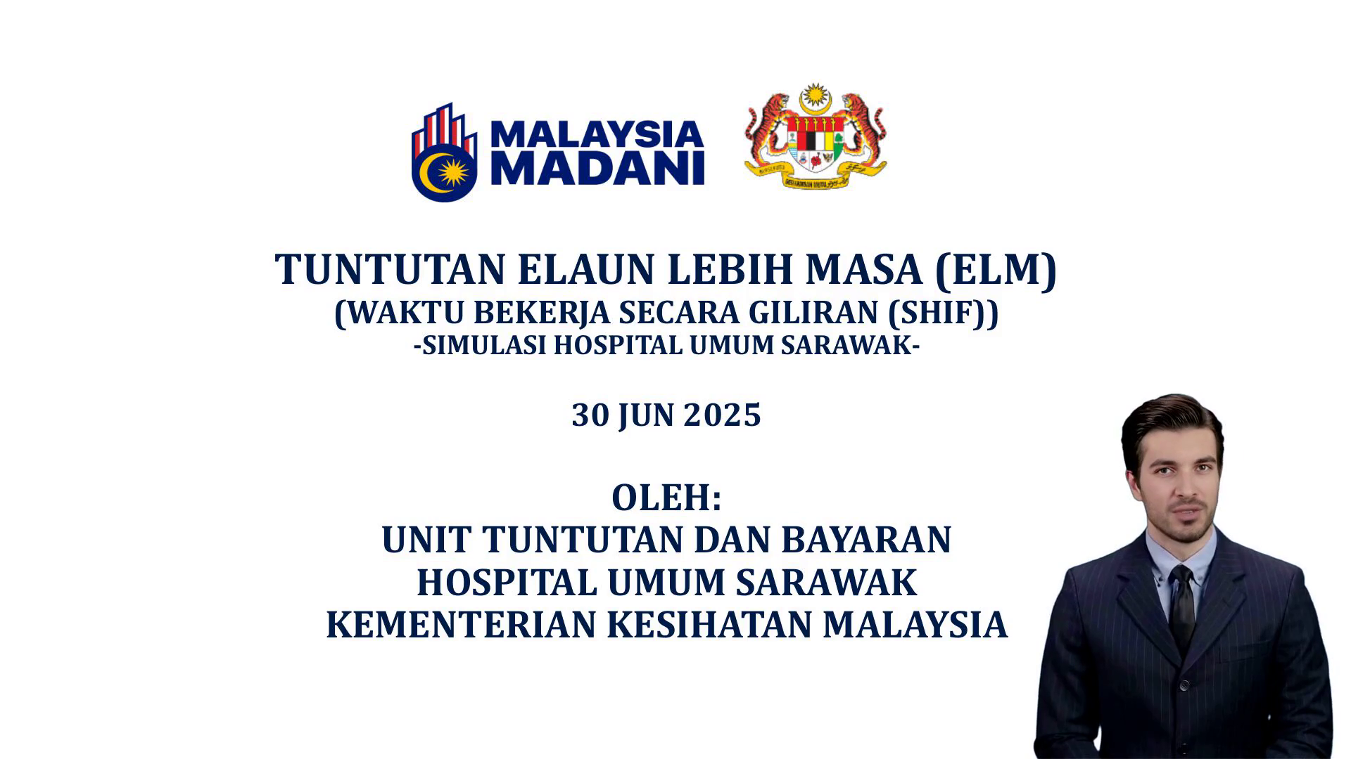 [Virtual Presenter] Tuntutan Elaun Lebih Masa (elm) (waktu Bekerja Secara Giliran (shif)) -simulasi Hospital Umum Sarawak 30 JUN 2025 oleh: Unit Tuntutan Dan Bayaran Hospital Umum Sarawak Kementerian Kesihatan Malaysia.