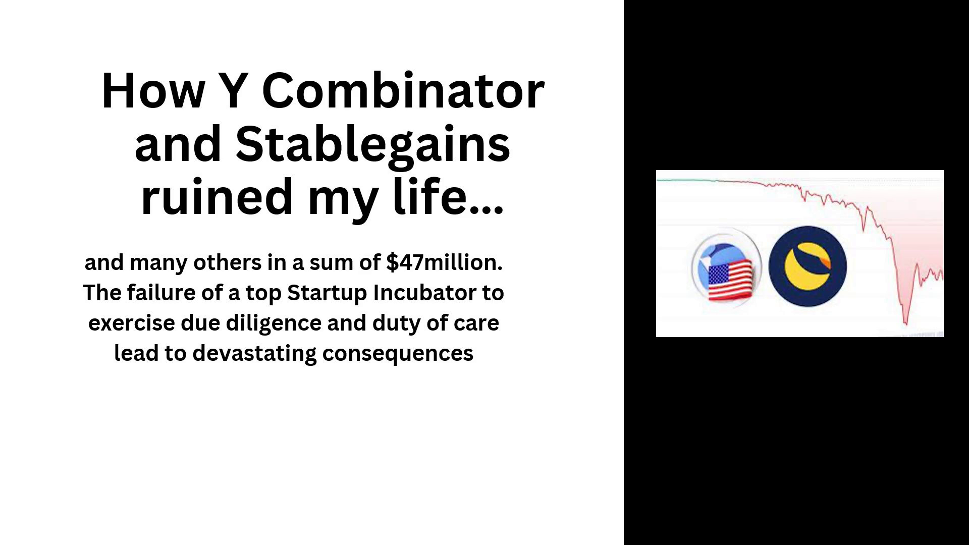 Stabelgains + Y Combinator. Stablegains used Y combinator to establish credibility and prestige when marketing their business Responsibilities Y Combinator had as a Start up Accelerator Mentorship and guidance Due Diligence - expected to conduct this before selecting a start up for their program Did they knowingly allow Stablegains to use lie about their claims of mitigating their risk? Post Program support assisting start-ups navigating post-accelerator challenges Were they also involved in the post-depegging scramble where they scrubbed their pages with new language? Accelerators should provide guidelines on how they represent them in pubicly.