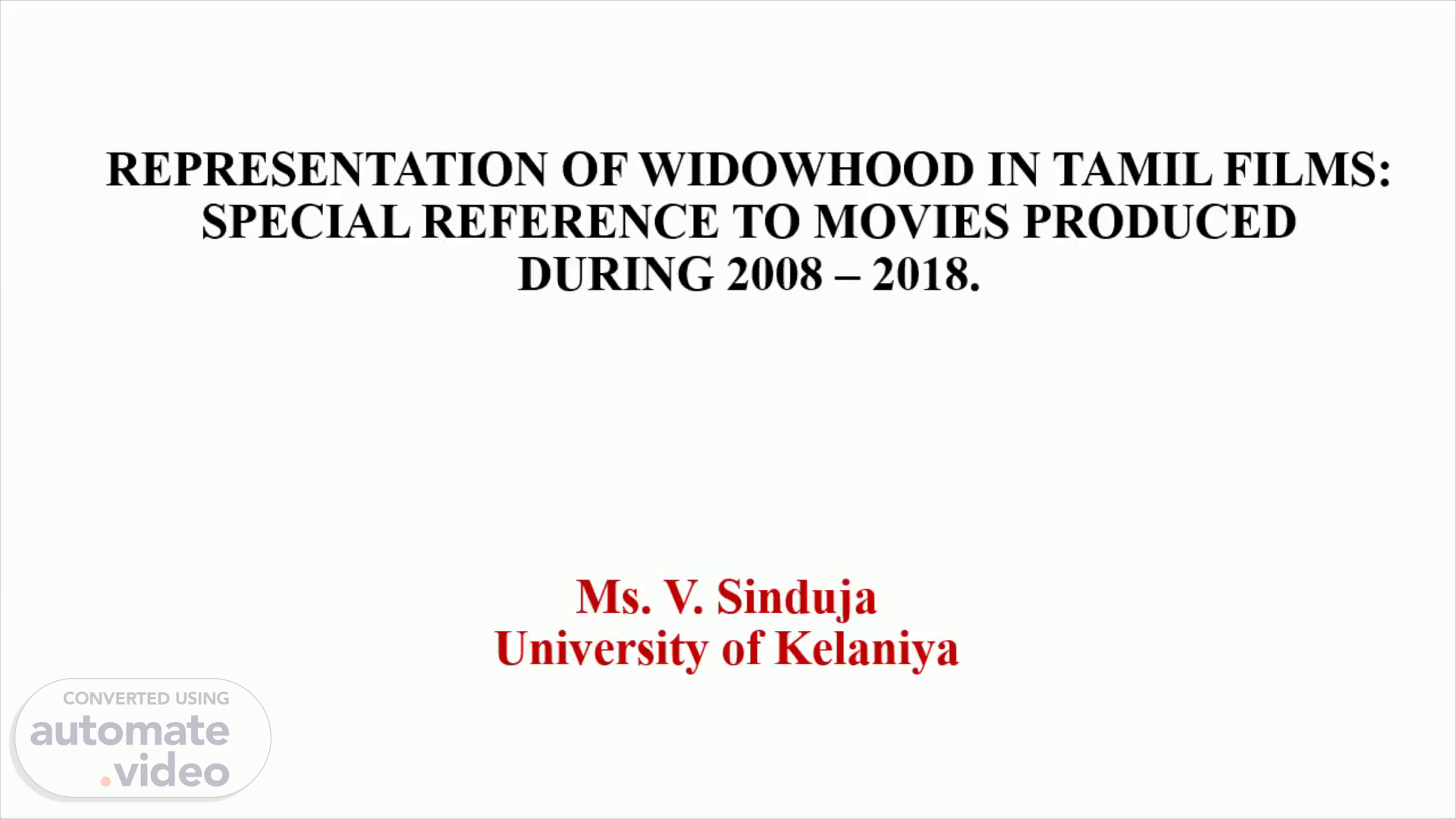 2. Objective of the Study The primary objective: To find out how widows are represented in Tamil films. Specific objective: To find out how widowhood got significant handling in different periods of time in the Tamil film industry. 3. Research Questions: Q1: How the Hindu culture and rituals related to the widows are depicted in the Tamil films? Q2: How the society is dealing with such problems? Q3: What are the changes to represent them in recent Tamil films?.