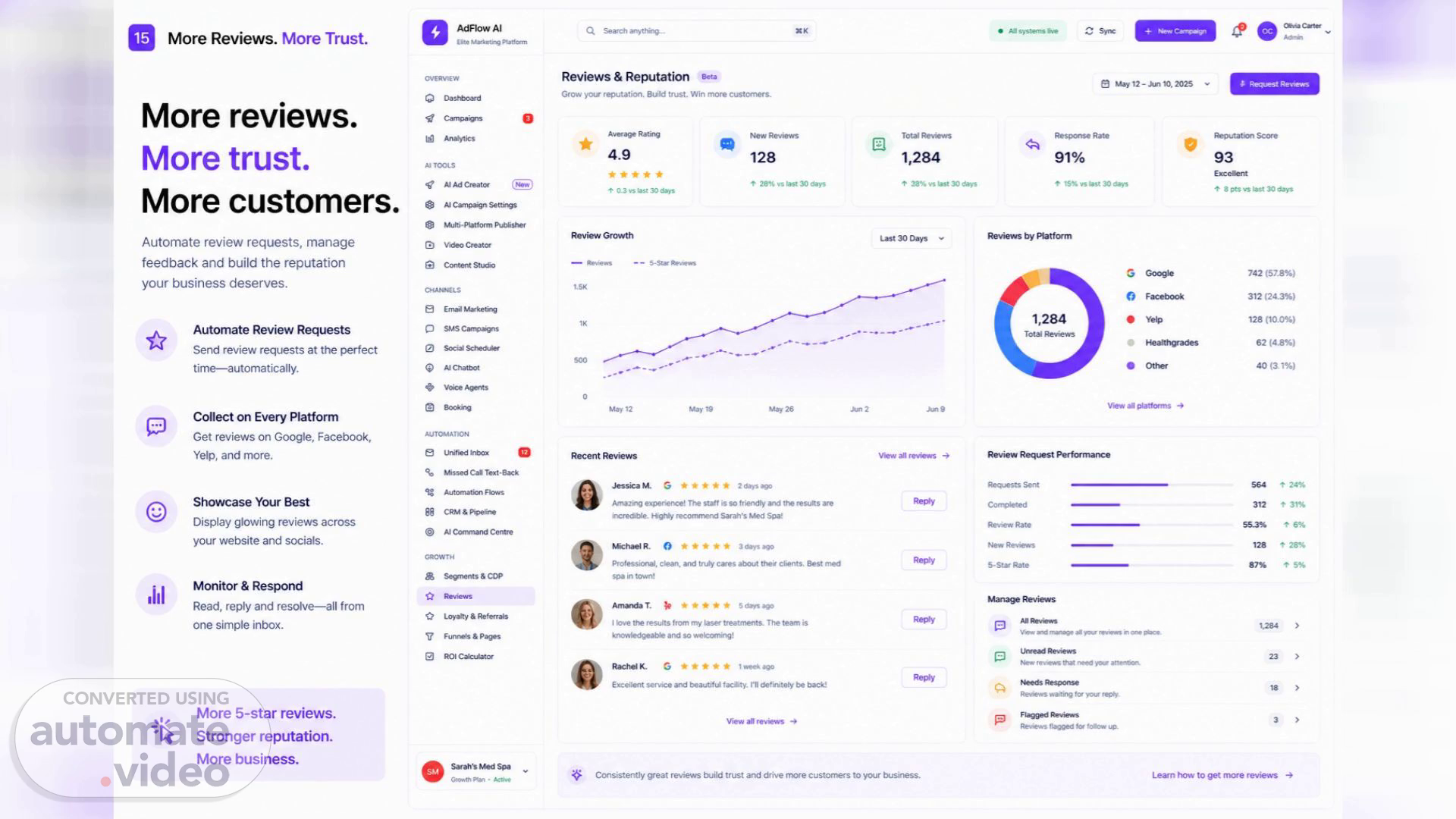 [Audio] . AdF10w A1 15 More Reviews. More Trust. Q Search anything.. Reviews & Reputation Grow you reputation. BuiE trust. Win more custonWS_ Rev•ews More reviews. More trust. More customers. Automate review requests, manage feedback and build the reputation your business deserves. Automate Review Requests Send review requests at the perfect time—automatically. Collect on Every Platform Get reviews on Google, Facebook, Yelp, and more. Showcase Your Best Display glowing reviews across your website and socials. Monitor & Respond Read, reply and resolve—all from one simple inbox. More 5-star reviews. Stronger reputation. More business. vs days uay 88 o PubWW Stufi Ervil SMS A1 Tet • Flows CRM & Pipeline Segments & cop (Malty & Ratirq 4.9 t 0.3 30 days Review Growth uay Recent Reviews 128 May12-Jun10. 2025 Response Ra te 91% t 1S%vs1ast30davs 1,284 -t 30 days Last 30 DM View a" revwws Reviews by Platform 1,284 Total Review Request Review Rate Rate Manage Reviews Vow that 0 View all Yelp tthgrades Other Repu tation Se«e 93 Excellent 8 pts vS 30 days 742 (578%) 312 (24.3%) 128 (10.0%) 62 (4.8%) 40 (31%) Amazing Staff is Higüy Suah•s Spa! R. O 3 days Clean , Care-S ClWntS_ Best Soa town! S days ago I love results my treatrtW1tS_ team so Excellent service and beautfd tacility. definitely be bEk! Consistently great reviews build trust and drive customers to business. 128 28% Leun to more reviews •i.