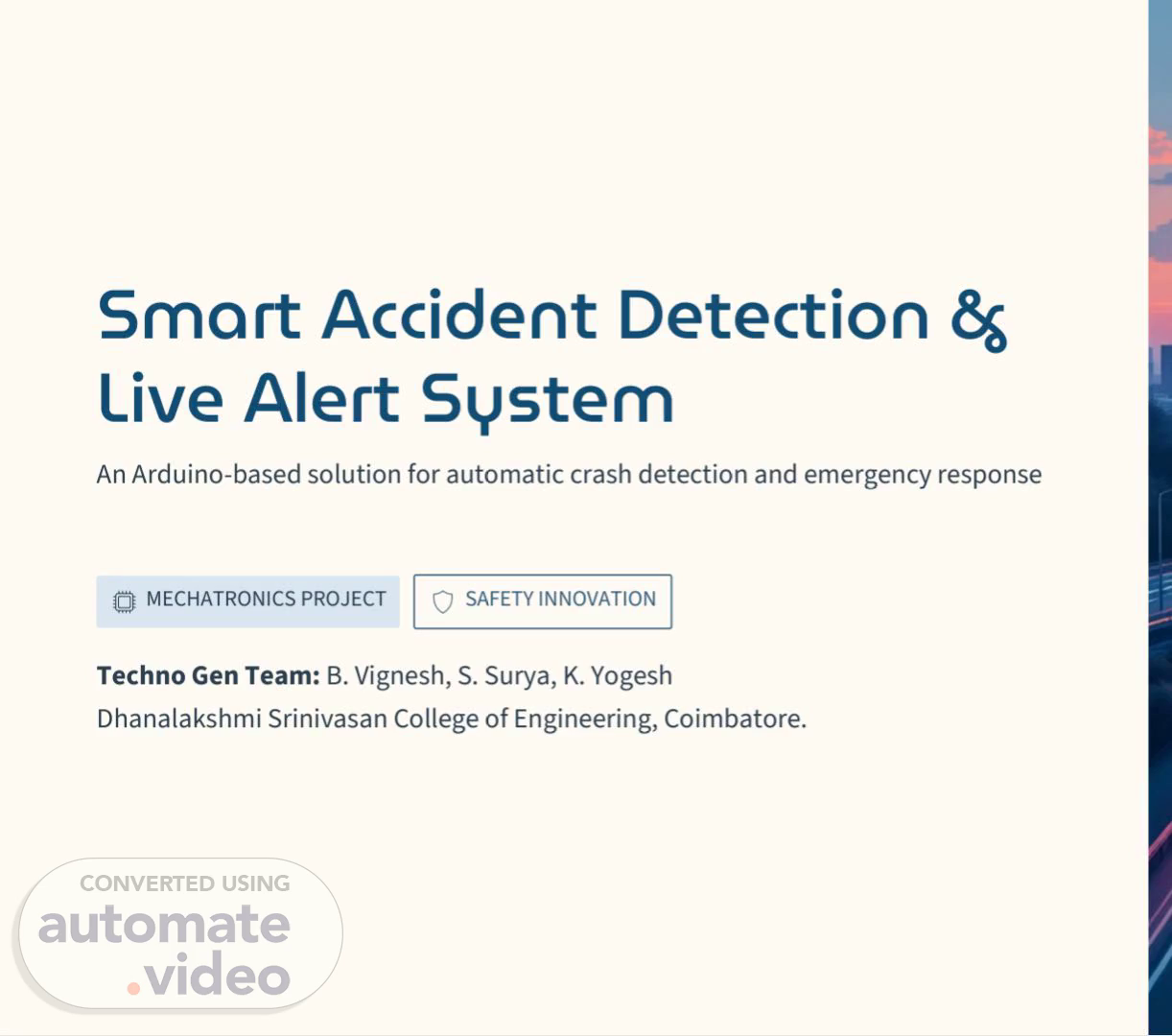 [Virtual Presenter] Smart Accident Detection & Live Alert System An Arduino-based solution for automatic crash detection and emergency response MECHATRONICS PROJECT SAFETY INNOVATION Techno Gen Team: B. Vignesh, S. Surya, K. Yogesh Dhanalakshmi Srinivasan College of Engineering, Coimbatore..