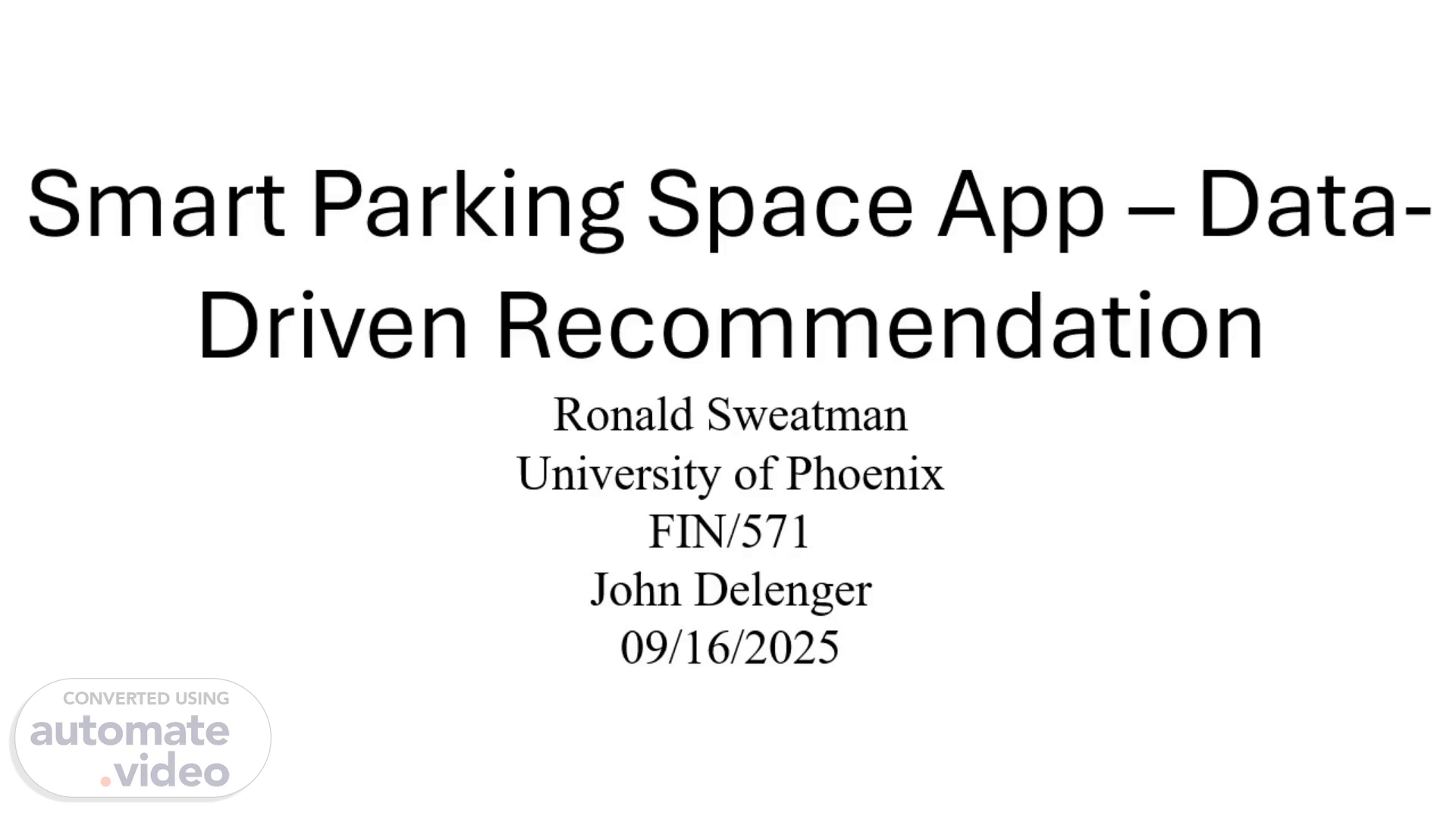 [Audio] Smart Parking Space App – Data-Driven Recommendation Ronald Sweatman University of Phoenix FIN/571 John Delenger 09/16/2025.