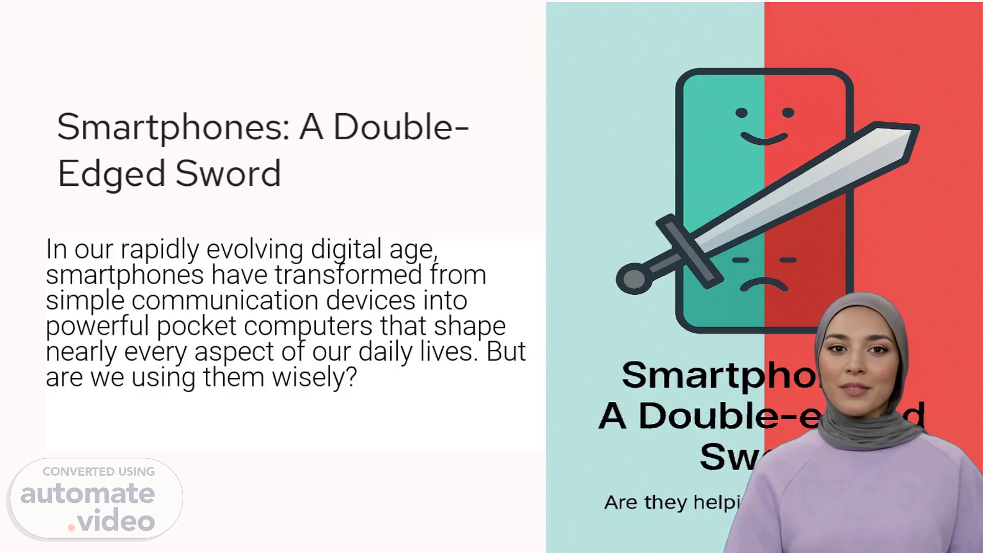 [Virtual Presenter] Smartphones have undergone a significant transformation over the years, evolving from simple communication devices into sophisticated tools that play a crucial role in shaping nearly every aspect of our daily lives. These devices now offer a wide range of functionalities beyond just making phone calls and sending texts, including access to the internet, social media, email, and various forms of entertainment such as music, videos, and games. Furthermore, smartphones have enabled instant global connectivity, allowing users to stay connected with friends and family across different parts of the world, regardless of geographical distance. However, despite these benefits, there are also concerns about the impact of smartphones on our lives. Many people use their smartphones excessively, often to the point where it interferes with other aspects of their lives, such as work, relationships, and physical health. This excessive usage can lead to addiction, decreased productivity, and negative impacts on mental health. Moreover, the constant availability of smartphones can create anxiety and stress, particularly among young people who may feel pressure to constantly be connected and available. The widespread adoption of smartphones has also raised questions about the effects of technology on society as a whole. Some argue that smartphones have created new opportunities for social interaction and connection, while others claim that they have contributed to feelings of loneliness and isolation. Additionally, the rise of social media has led to concerns about the spread of misinformation and the erosion of traditional values. In conclusion, the impact of smartphones on our lives is complex and multifaceted. While they offer many benefits, they also pose significant challenges that require careful consideration and responsible use. By acknowledging these complexities and taking steps to mitigate their negative effects, we can harness the full potential of smartphones to improve our lives and communities..