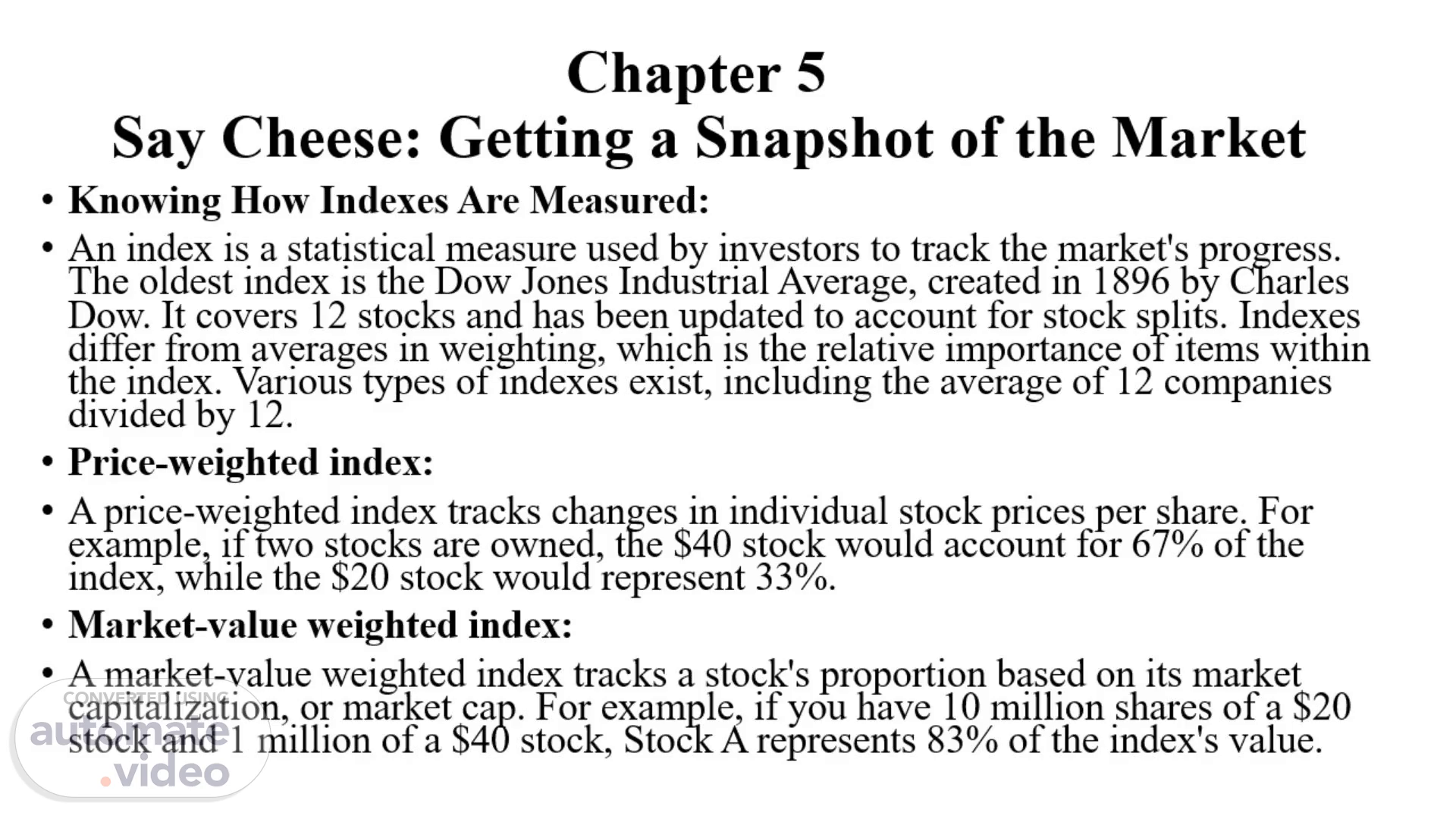 [Audio] Chapter 5 Say Cheese: Getting a Snapshot of the Market Knowing How Indexes Are Measured: An index is a statistical measure used by investors to track the market's progress. The oldest index is the Dow Jones Industrial Average, created in 1896 by Charles Dow. It covers 12 stocks and has been updated to account for stock splits. Indexes differ from averages in weighting, which is the relative importance of items within the index. Various types of indexes exist, including the average of 12 companies divided by 12. Price-weighted index: A price-weighted index tracks changes in individual stock prices per share. For example, if two stocks are owned, the $40 stock would account for 67% of the index, while the $20 stock would represent 33%. Market-value weighted index: A market-value weighted index tracks a stock's proportion based on its market capitalization, or market cap. For example, if you have 10 million shares of a $20 stock and 1 million of a $40 stock, Stock A represents 83% of the index's value..