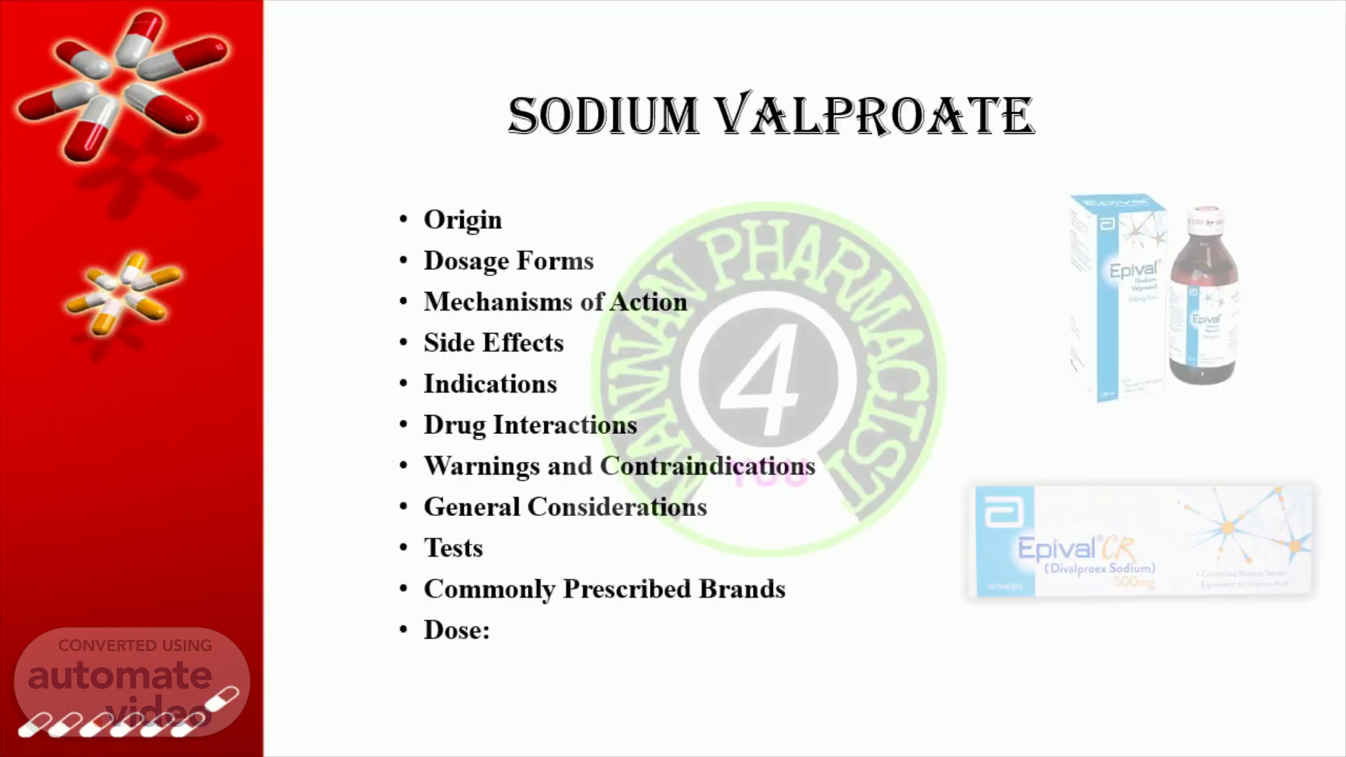 Sodium Valproate. Origin Dosage Forms Mecha nisms of Action Side Effects Indicatio ns Drug Interactions Warning s and Contraindications General Considerations Tests Commonly Prescribed Brands Dose:.